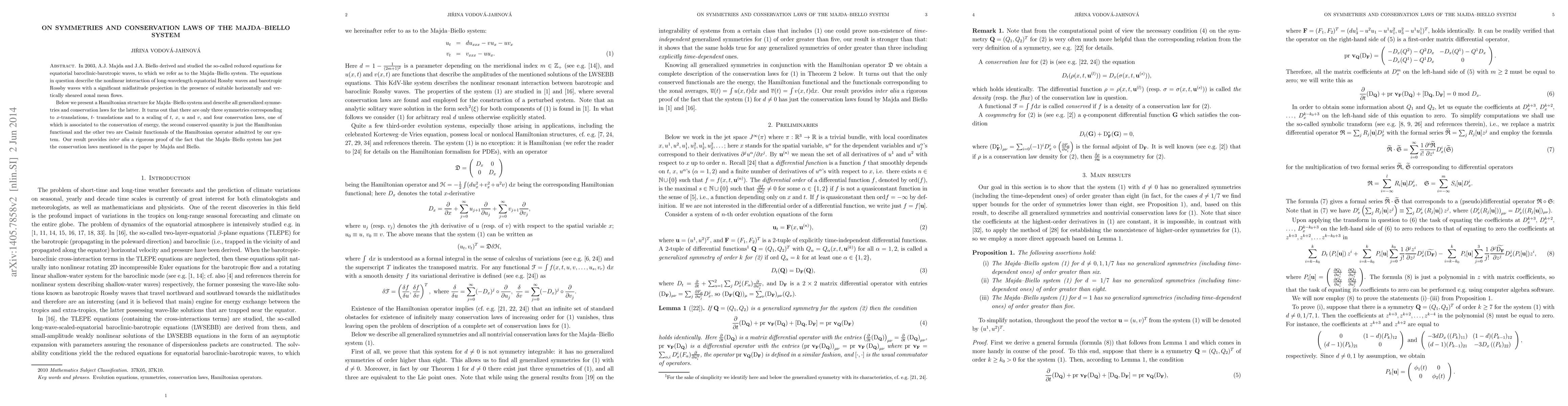 In 2003, A.J. Majda and J.A. Biello derived and studied the so-called reduced equations for equatorial baroclinic-barotropic waves, to which we refer as to the Majda-Biello system. The equations in question describe the nonlinear interaction of long-wavelength equatorial Rossby waves and barotropic Rossby waves with a significant midlatitude projection in the presence of suitable horizontally and vertically sheared zonal mean flows. Below we present a Hamiltonian structure for Majda-Biello system and describe all generalized symmetries and conservation laws for the latter. It turns out that there are only three symmetries corresponding to x-translations, t- translations and to a scaling of t, x, u and v, and four conservation laws, one of which is associated to the conservation of energy, the second conserved quantity is just the Hamiltonian functional and the other two are Casimir functionals of the Hamiltonian operator admitted by our system. Our result provides inter alia a rigorous proof of the fact that the Majda-Biello system has just the conservation laws mentioned in the paper by Majda and Biello.