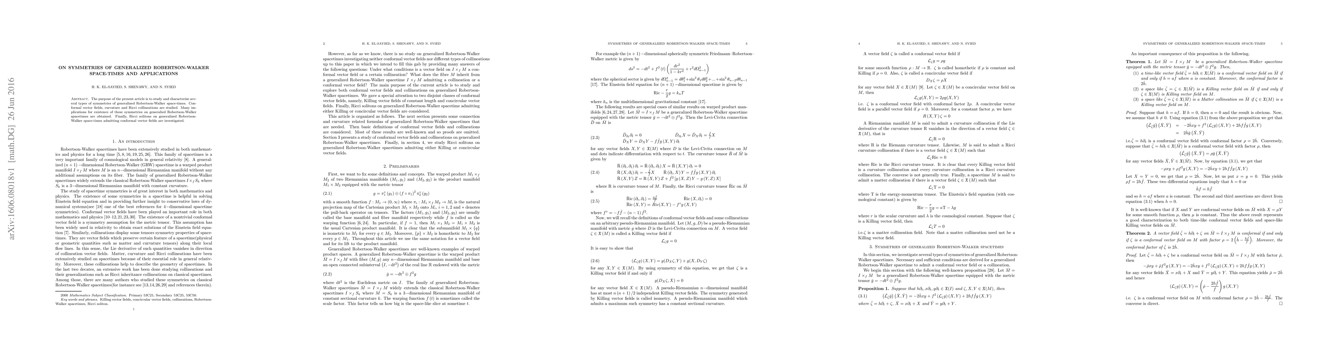 This paper explores various symmetries in generalized Robertson-Walker space-times, including conformal vector fields, curvature, and Ricci collineations, and investigates Ricci solitons in the presence of conformal vector fields. The findings provide implications for the existence of these symmetries.