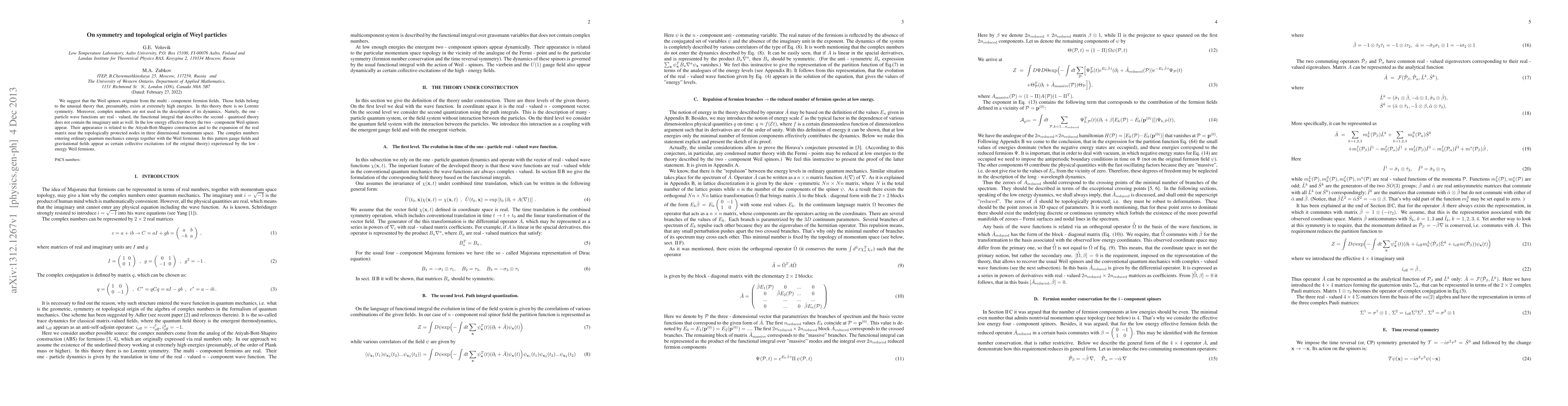 We suggest that the Weil spinors originate from the multi - component fermion fields. Those fields belong to the unusual theory that, presumably, exists at extremely high energies. In this theory there is no Lorentz symmetry. Moreover, complex numbers are not used in the description of its dynamics. Namely, the one - particle wave functions are real - valued, the functional integral that describes the second - quantised theory does not contain the imaginary unit as well. In the low energy effective theory the two - component Weil spinors appear. Their appearance is related to the Atiyah-Bott-Shapiro construction and to the expansion of the real matrix near the topologically protected nodes in three dimensional momentum space. The complex numbers entering ordinary quantum mechanics emerge together with the Weil fermions. In this pattern gauge fields and gravitational fields appear as certain collective excitations (of the original theory) experienced by the low - energy Weil fermions.