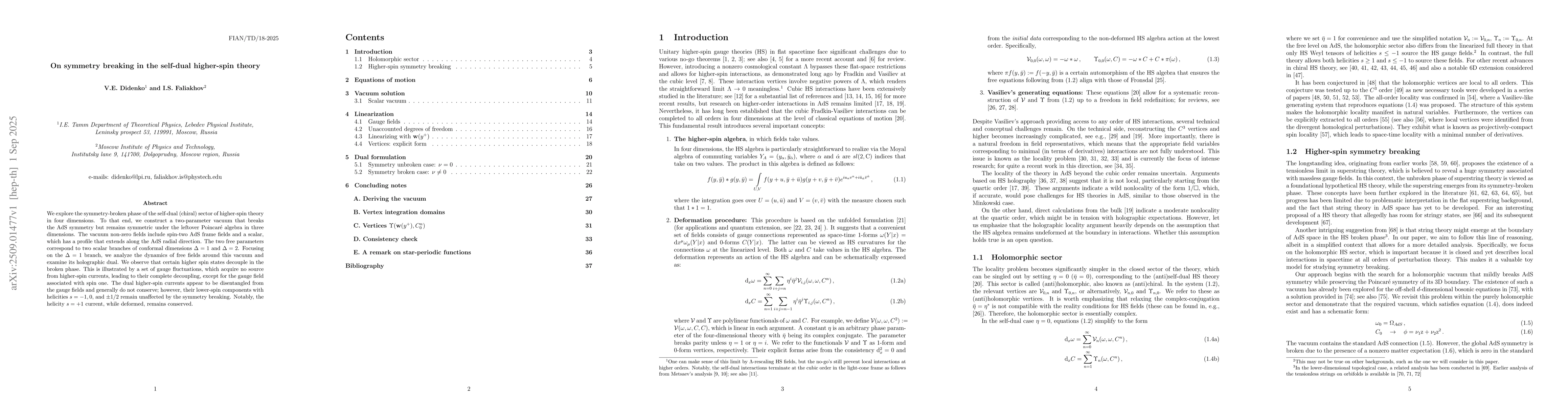 We explore the symmetry-broken phase of the self-dual (chiral) sector of higher-spin theory in four dimensions. To that end, we construct a two-parameter vacuum that breaks the AdS symmetry but remains symmetric under the leftover Poincar\'{e} algebra in three dimensions. The vacuum non-zero fields include spin-two AdS frame fields and a scalar, which has a profile that extends along the AdS radial direction. The two free parameters correspond to two scalar branches of conformal dimensions $\Delta=1$ and $\Delta=2$. Focusing on the $\Delta=1$ branch, we analyze the dynamics of free fields around this vacuum and examine its holographic dual. We observe that certain higher spin states decouple in the broken phase. This is illustrated by a set of gauge fluctuations, which acquire no source from higher-spin currents, leading to their complete decoupling, except for the gauge field associated with spin one. The dual higher-spin currents appear to be disentangled from the gauge fields and generally do not conserve; however, their lower-spin components with helicities $s = -1, 0$, and $\pm 1/2$ remain unaffected by the symmetry breaking. Notably, the helicity $s=+1$ current, while deformed, remains conserved.