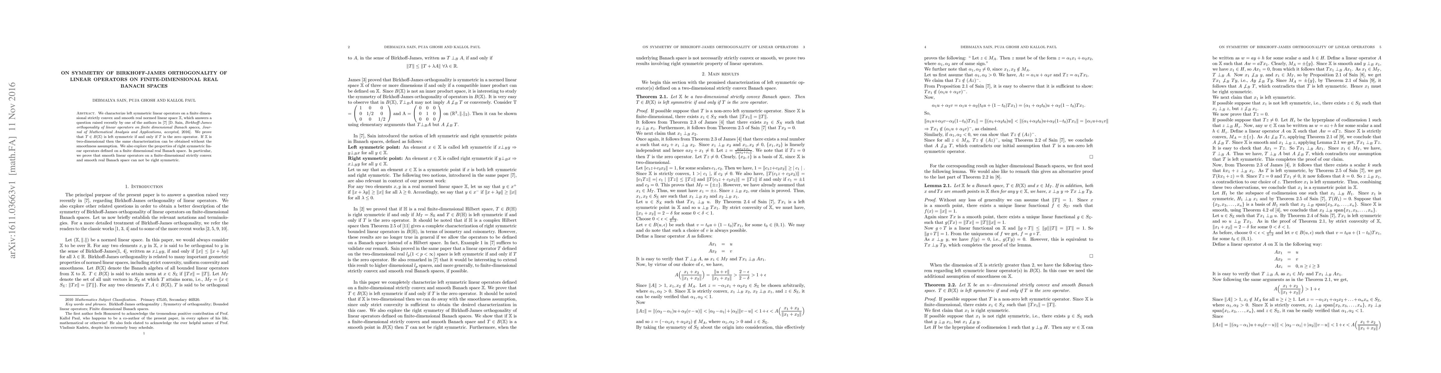 We characterize left symmetric linear operators on a finite dimensional strictly convex and smooth real normed linear space $ \mathbb{X},$ which answers a question raised recently by one of the authors in \cite{S} [D. Sain, \textit{Birkhoff-James orthogonality of linear operators on finite dimensional Banach spaces, Journal of Mathematical Analysis and Applications, accepted, $ 2016 $}]. We prove that $ T\in B(\mathbb{X}) $ is left symmetric if and only if $ T $ is the zero operator. If $ \mathbb{X} $ is two-dimensional then the same characterization can be obtained without the smoothness assumption. We also explore the properties of right symmetric linear operators defined on a finite dimensional real Banach space. In particular, we prove that smooth linear operators on a finite-dimensional strictly convex and smooth real Banach space can not be right symmetric.