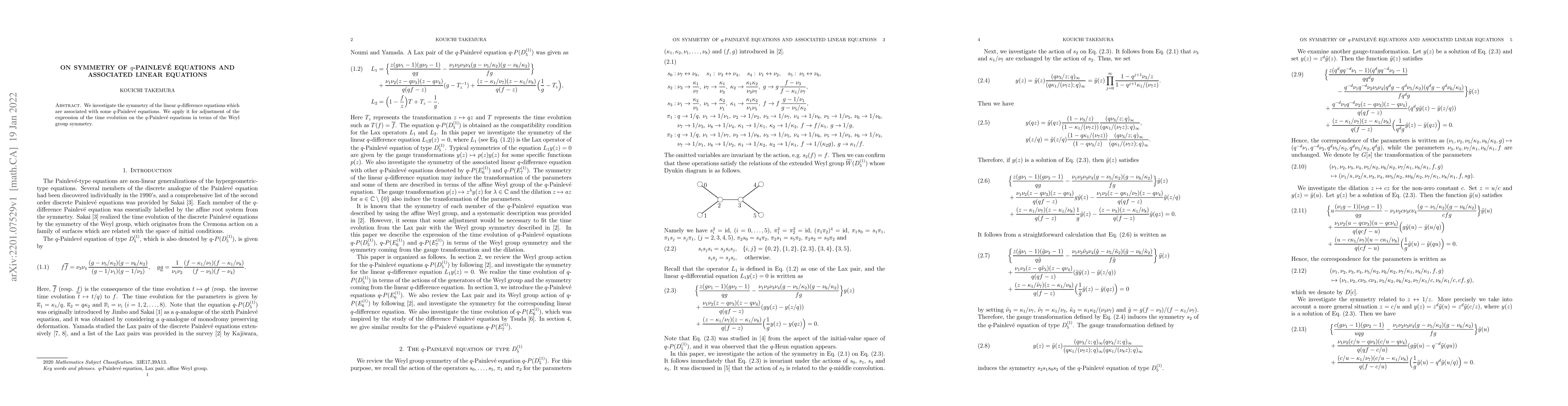 This paper investigates symmetry in q-Painlevé equations and associated linear equations to improve their time evolution expressions based on Weyl group symmetry. It focuses on key findings related to the adjustment of these expressions using q-difference equations.