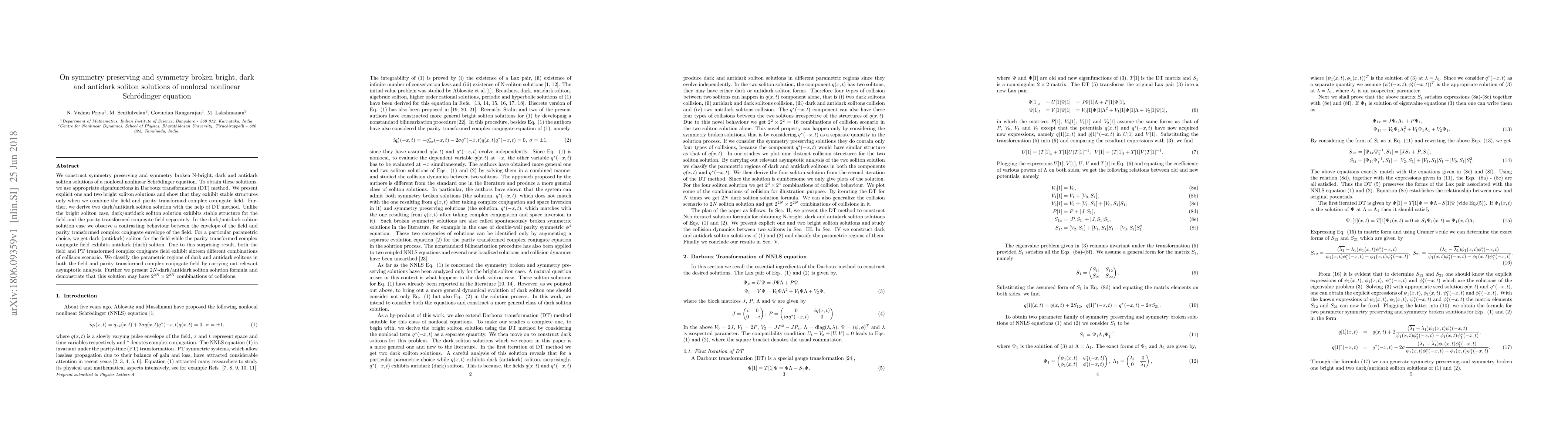 We construct symmetry preserving and symmetry broken N-bright, dark and antidark soliton solutions of a nonlocal nonlinear Schr\"{o}dinger equation. To obtain these solutions, we use appropriate eigenfunctions in Darboux transformation (DT) method. We present explicit one and two bright soliton solutions and show that they exhibit stable structures only when we combine the field and parity transformed complex conjugate field. Further, we derive two dark/antidark soliton solution with the help of DT method. Unlike the bright soliton case, dark/antidark soliton solution exhibits stable structure for the field and the parity transformed conjugate field separately. In the dark/antidark soliton solution case we observe a contrasting behaviour between the envelope of the field and parity transformed complex conjugate envelope of the field. For a particular parametric choice, we get dark (antidark) soliton for the field while the parity transformed complex conjugate field exhibits antidark (dark) soliton. Due to this surprising result, both the field and PT transformed complex conjugate field exhibit sixteen different combinations of collision scenario. We classify the parametric regions of dark and antidark solitons in both the field and parity transformed complex conjugate field by carrying out relevant asymptotic analysis. Further we present $2N$-dark/antidark soliton solution formula and demonstrate that this solution may have $2^{2N}\times 2^{2N}$ combinations of collisions.