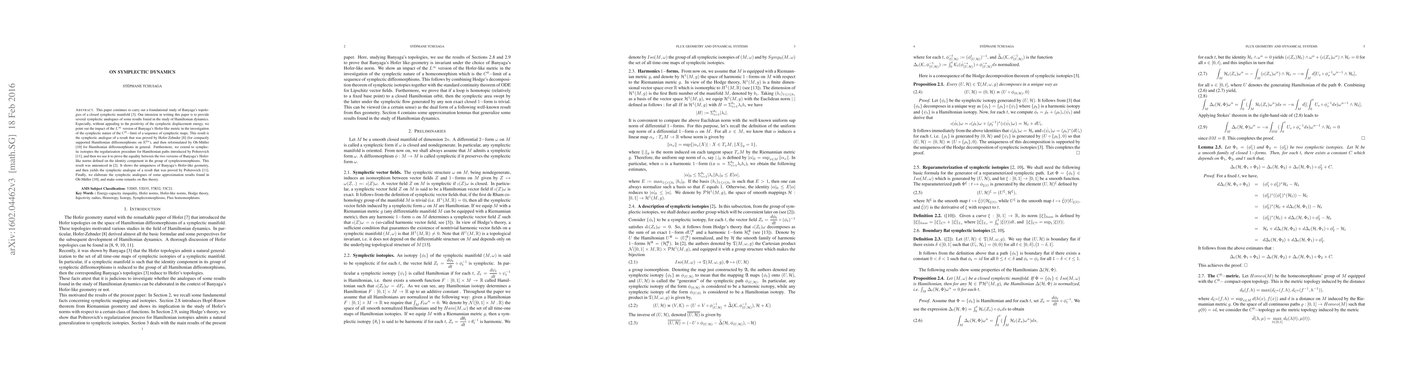 This paper continues to carry out a foundational study of Banyaga topologies of a closed symplectic manifold [3]. Our intension in writing this paper is to provide several symplectic analogues of some results found in the study of Hamiltonian dynamics. Especially, without appealing to the positivity of the symplectic displacement energy, we point out the impact of the $L^\infty$ version of Banyaga Hofer-like metric in the investigation of the symplectic nature of the $C^0-$limit of a sequence of symplectic maps. This result is the symplectic analogue of a result that was proved in Hofer-Zehnder [8] (for compactly supported Hamiltonian diffeomorphisms on $\mathbb{R}^{2n}$), and then reformulated in Oh-M\"{u}ller [10] for Hamiltonian diffeomorphisms in general. Furthermore, we extend to symplectic isotopies the regularization procedure for Hamiltonian paths introduced in Polterovich [11], and then we use it to prove the equality between the two versions of Banyaga Hofer-like norms defined on the identity component in the group of symplectomorphisms. This result was announced in [2]. It shows the uniqueness of Banyaga Hofer-like geometry, and then yields the symplectic analogue of a result that was proved in Polterovich [11]. Finally, we elaborate the symplectic analogues of some approximation results found in Oh-M\"{u}ller [10], and make some remarks on flux theory.