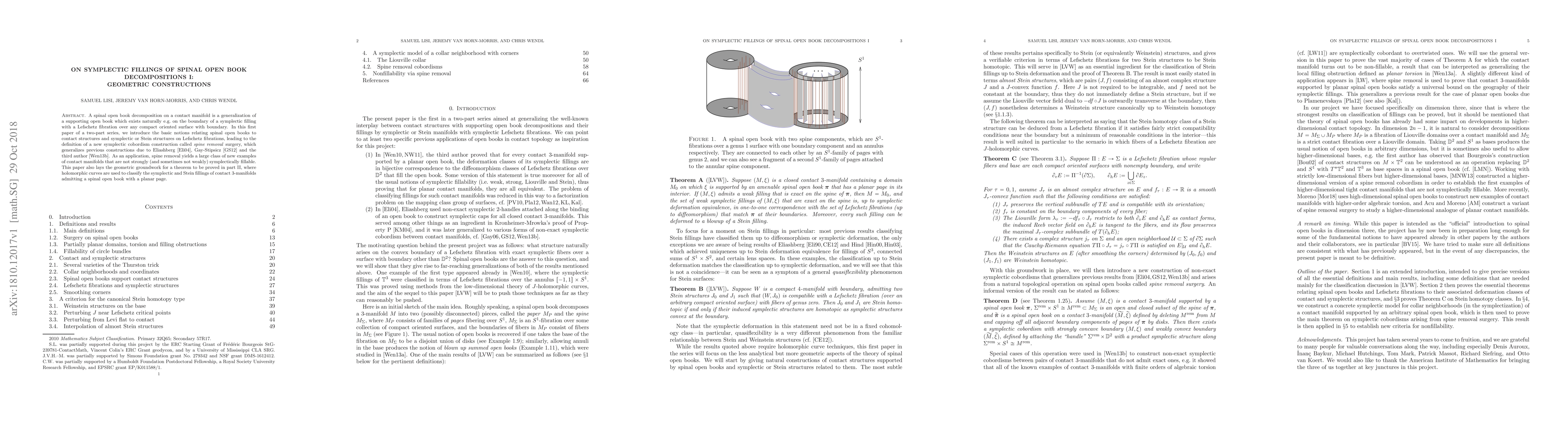 This paper introduces spinal open book decompositions on contact manifolds and presents the geometric constructions that relate them to symplectic and Stein fillings. It defines a new cobordism construction called spine removal surgery, providing examples of contact manifolds that are not symplectically fillable, and sets the stage for classifying symplectic fillings using holomorphic curves in a subsequent part.