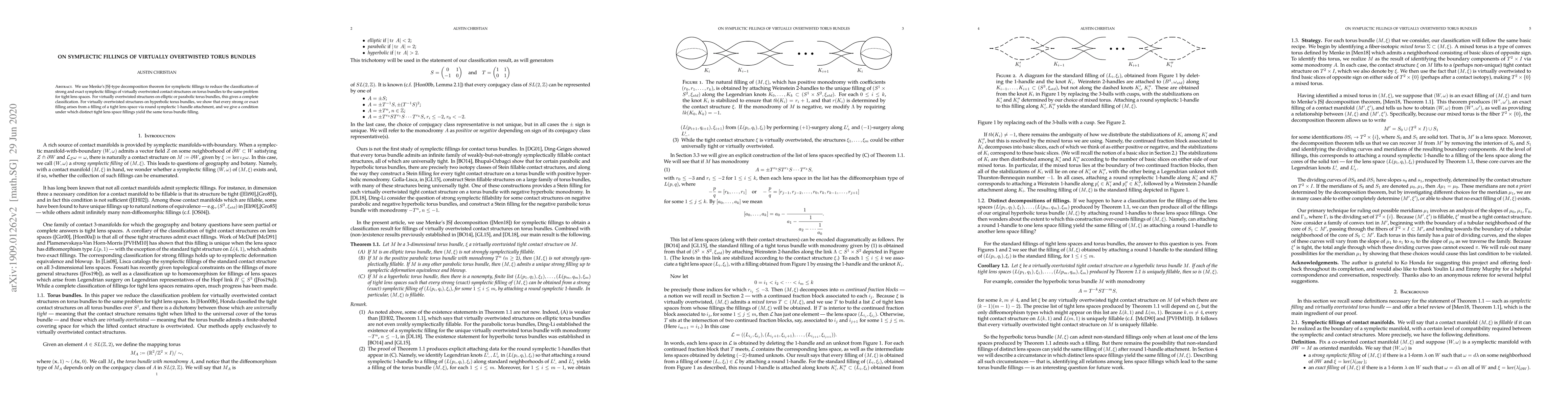 The paper classifies strong and exact symplectic fillings of virtually overtwisted torus bundles using Menke's JSJ-type decomposition theorem, reducing the problem to tight lens spaces, and provides a complete classification for elliptic or parabolic bundles. For hyperbolic bundles, it shows that fillings derive from tight lens spaces via round symplectic 1-handles, with conditions for distinct fillings yielding the same torus bundle.