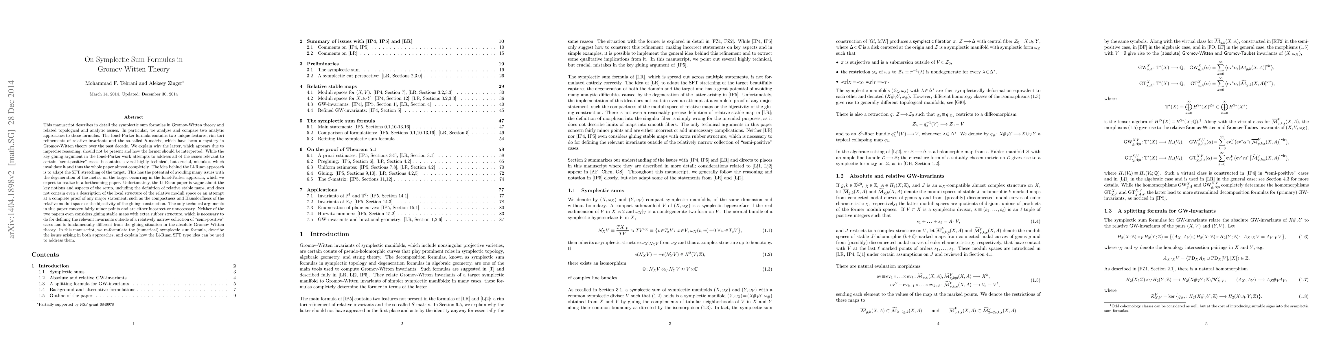 This manuscript describes in detail the symplectic sum formulas in Gromov-Witten theory and related topological and analytic issues. In particular, we analyze and compare two analytic approaches to these formulas. The Ionel-Parker formula contains two unique features, rim tori refinements of relative invariants and the so-called S-matrix, which have been a mystery in GW-theory over the past decade. We explain why the latter, which appears due to imprecise reasoning, should not be present and how the former should be interpreted. While the gluing argument in the IP work attempts to address all of the issues relevant to certain "semi-positive" cases, it contains several highly technical, but crucial, mistakes, which invalidate it and thus the whole paper almost completely. The SFT type idea behind the Li-Ruan approach has the potential of avoiding many issues with the degeneration of the metric on the target occurring in the IP approach. Unfortunately, the LR paper is vague about the key notions and aspects of the setup, including the definition of relative stable maps, and does not contain even a description of the local structure of the relative moduli space or an attempt at a complete proof of any major statement. The only technical arguments in this paper concern fairly minor points and are either incorrect or unnecessary. Neither of the two papers even considers gluing stable maps with extra rubber structure, which is necessary for defining the relevant invariants outside of a relatively narrow collection of "semi-positive" cases. In this manuscript, we re-formulate the (numerical) symplectic sum formula, describe the issues arising in both approaches, and explain how the Li-Ruan SFT type idea can be used to address them.