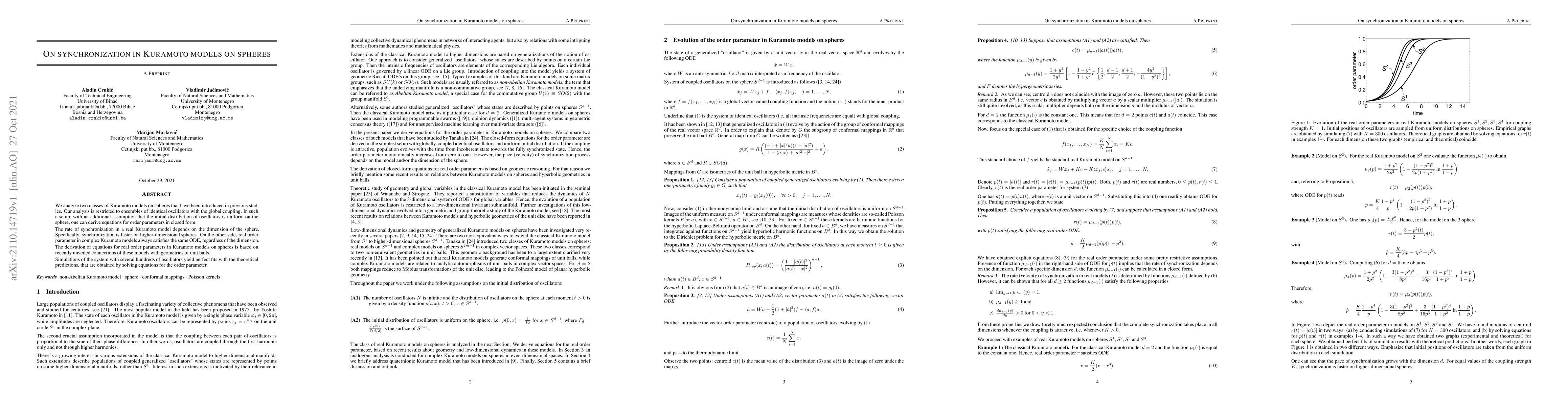 This paper investigates synchronization in Kuramoto models on spheres, deriving closed-form equations for order parameters under global coupling and uniform initial distributions. It finds that synchronization is faster on higher-dimensional spheres, while the real order parameter's dynamics remain constant across dimensions in complex Kuramoto models.