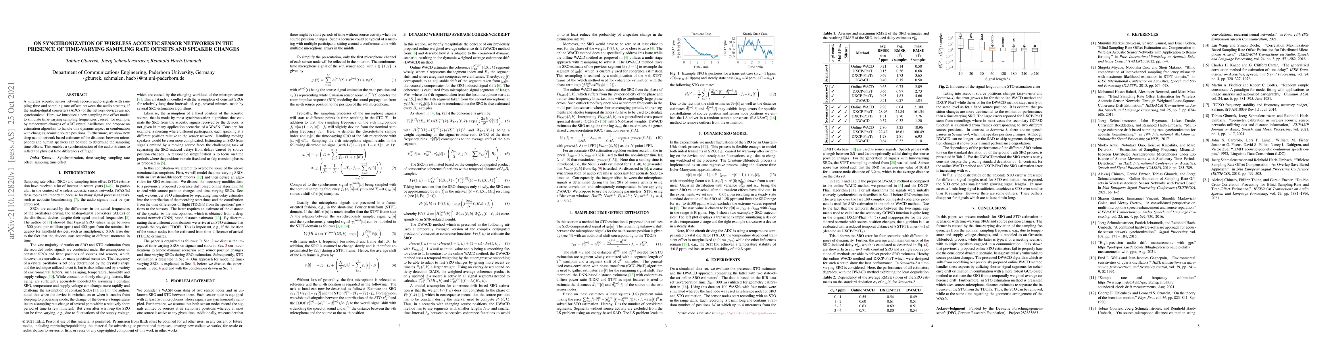 A wireless acoustic sensor network records audio signals with sampling time and sampling rate offsets between the audio streams, if the analog-digital converters (ADCs) of the network devices are not synchronized. Here, we introduce a new sampling rate offset model to simulate time-varying sampling frequencies caused, for example, by temperature changes of ADC crystal oscillators, and propose an estimation algorithm to handle this dynamic aspect in combination with changing acoustic source positions. Furthermore, we show how deep neural network based estimates of the distances between microphones and human speakers can be used to determine the sampling time offsets. This enables a synchronization of the audio streams to reflect the physical time differences of flight.