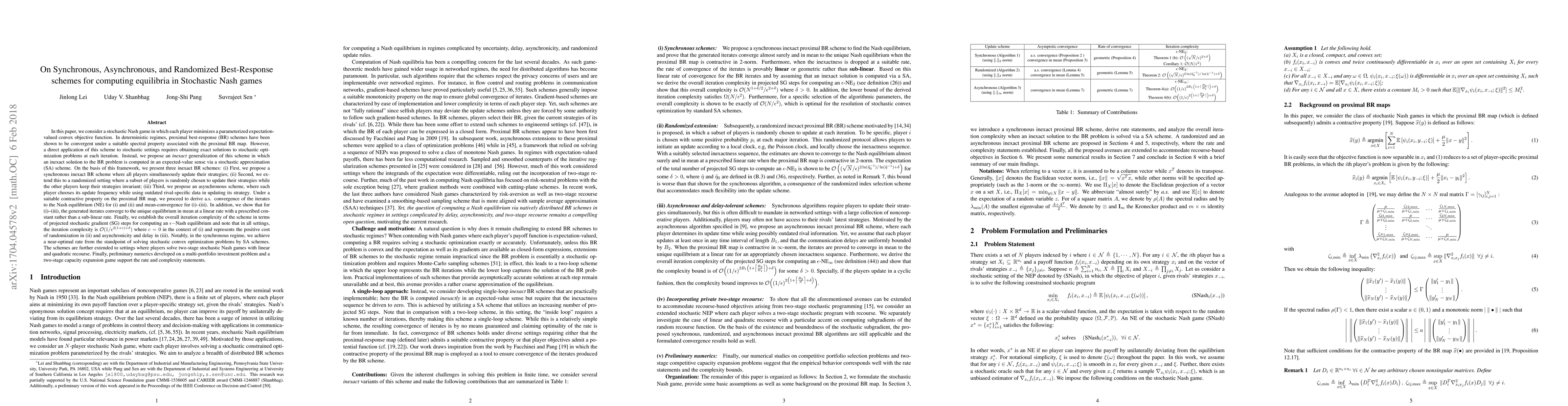 This work considers a stochastic Nash game in which each player solves a parameterized stochastic optimization problem. In deterministic regimes, best-response schemes have been shown to be convergent under a suitable spectral property associated with the proximal best-response map. However, a direct application of this scheme to stochastic settings requires obtaining exact solutions to stochastic optimization at each iteration. Instead, we propose an inexact generalization in which an inexact solution is computed via an increasing number of projected stochastic gradient steps. Based on this framework, we present three inexact best-response schemes: (i) First, we propose a synchronous scheme where all players simultaneously update their strategies; (ii) Subsequently, we extend this to a randomized setting where a subset of players is randomly chosen to their update strategies while the others keep their strategies invariant; (iii) Finally, we propose an asynchronous scheme, where each player determines its own update frequency and may use outdated rival-specific data in updating its strategy. Under a suitable contractive property of the proximal best-response map, we derive a.s. convergence of the iterates for (i) and (ii) and mean-convergence for (i) -- (iii). In addition, we show that for (i) -- (iii), the iterates converge to the unique equilibrium in mean at a prescribed linear rate. Finally, we establish the overall iteration complexity in terms of projected stochastic gradient steps for computing an $\epsilon-$Nash equilibrium and in all settings, the iteration complexity is ${\cal O}(1/\epsilon^{2(1+c) + \delta})$ where $c = 0$ in the context of (i) and represents the positive cost of randomization (in (ii)) and asynchronicity and delay (in (iii)). The schemes are further extended to linear and quadratic recourse-based stochastic Nash games.