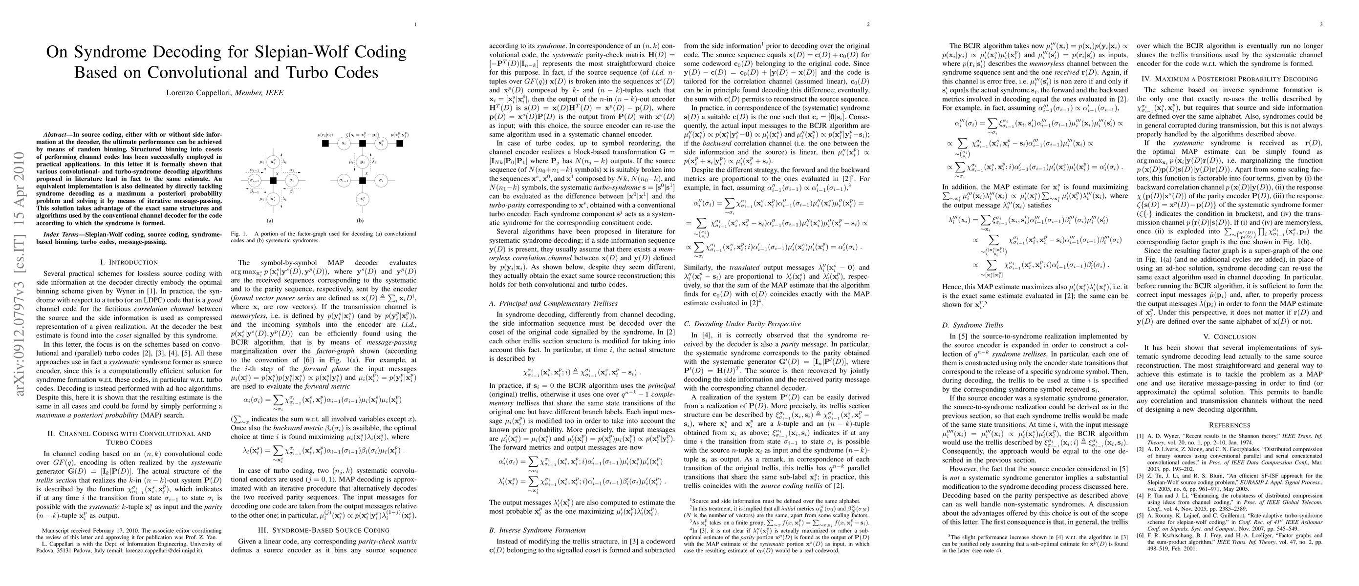 This paper demonstrates that various convolutional and turbo-code syndrome decoding algorithms yield the same estimate through structured binning. It proposes an equivalent implementation by solving syndrome decoding as a maximum a posteriori probability problem using iterative message-passing, leveraging the same structures and algorithms as conventional channel decoders.