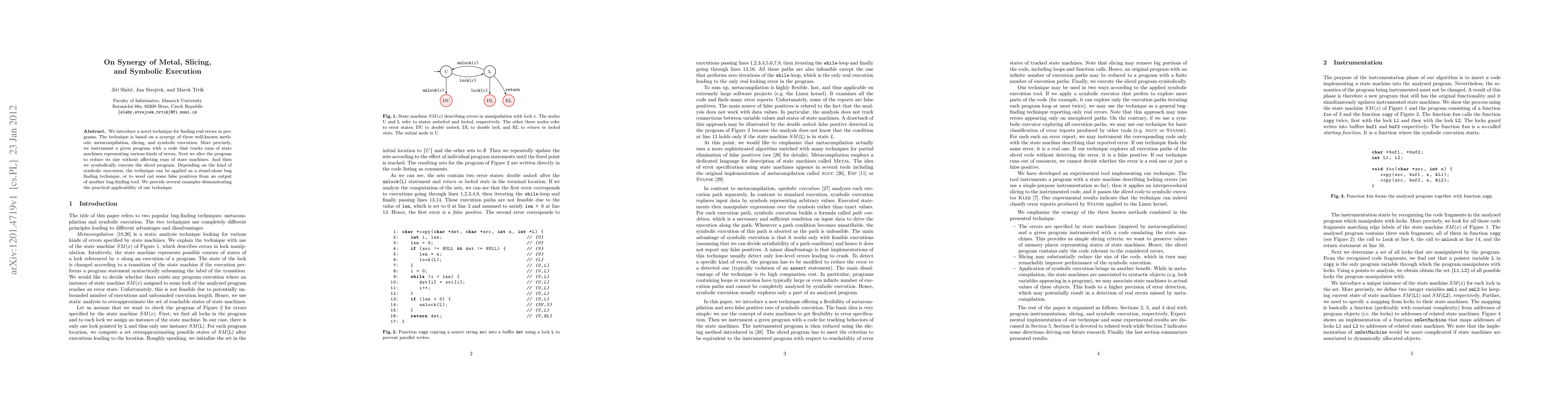 We introduce a novel technique for finding real errors in programs. The technique is based on a synergy of three well-known methods: metacompilation, slicing, and symbolic execution. More precisely, we instrument a given program with a code that tracks runs of state machines representing various kinds of errors. Next we slice the program to reduce its size without affecting runs of state machines. And then we symbolically execute the sliced program. Depending on the kind of symbolic execution, the technique can be applied as a stand-alone bug finding technique, or to weed out some false positives from an output of another bug-finding tool. We provide several examples demonstrating the practical applicability of our technique.