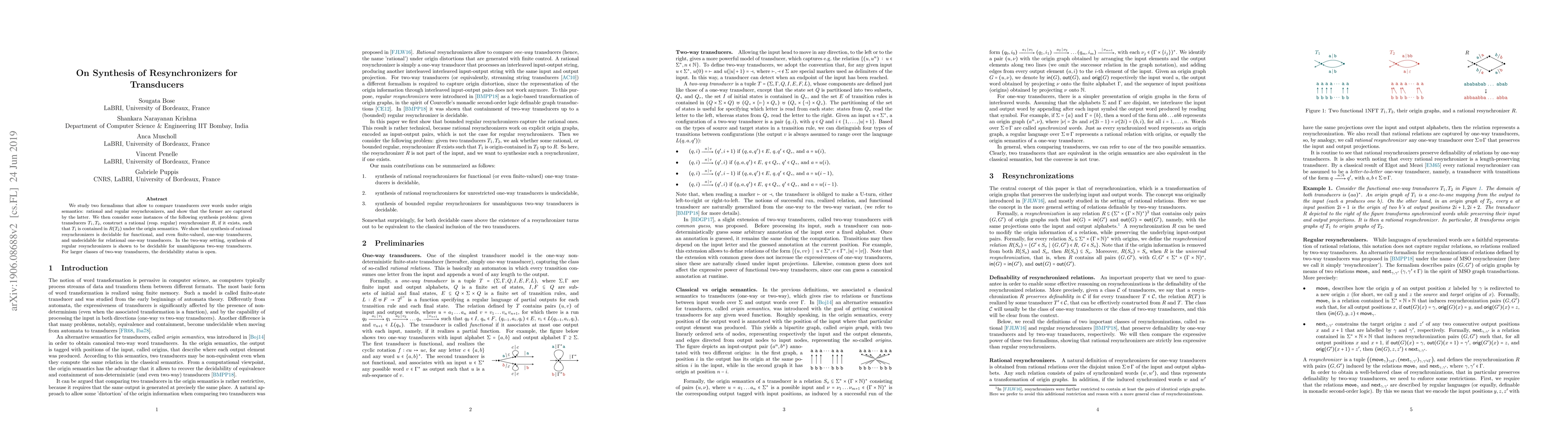 This paper investigates the synthesis of rational and regular resynchronizers for comparing transducers under origin semantics, demonstrating that rational resynchronizers are captured by regular ones. It presents decidability results for synthesizing rational resynchronizers for certain types of one-way transducers and regular resynchronizers for unambiguous two-way transducers.