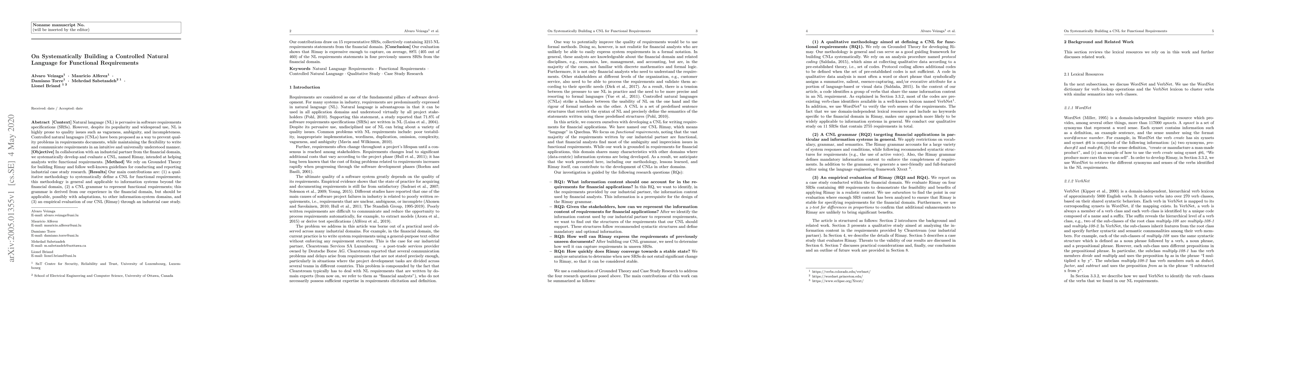 [Context] Natural language (NL) is pervasive in software requirements specifications (SRSs). However, despite its popularity and widespread use, NL is highly prone to quality issues such as vagueness, ambiguity, and incompleteness. Controlled natural languages (CNLs) have been proposed as a way to prevent quality problems in requirements documents, while maintaining the flexibility to write and communicate requirements in an intuitive and universally understood manner. [Objective] In collaboration with an industrial partner from the financial domain, we systematically develop and evaluate a CNL, named Rimay, intended at helping analysts write functional requirements. [Method] We rely on Grounded Theory for building Rimay and follow well-known guidelines for conducting and reporting industrial case study research. [Results] Our main contributions are: (1) a qualitative methodology to systematically define a CNL for functional requirements; this methodology is general and applicable to information systems beyond the financial domain, (2) a CNL grammar to represent functional requirements; this grammar is derived from our experience in the financial domain, but should be applicable, possibly with adaptations, to other information-system domains, and (3) an empirical evaluation of our CNL (Rimay) through an industrial case study. Our contributions draw on 15 representative SRSs, collectively containing 3215 NL requirements statements from the financial domain. [Conclusion] Our evaluation shows that Rimay is expressive enough to capture, on average, 88% (405 out of 460) of the NL requirements statements in four previously unseen SRSs from the financial domain.