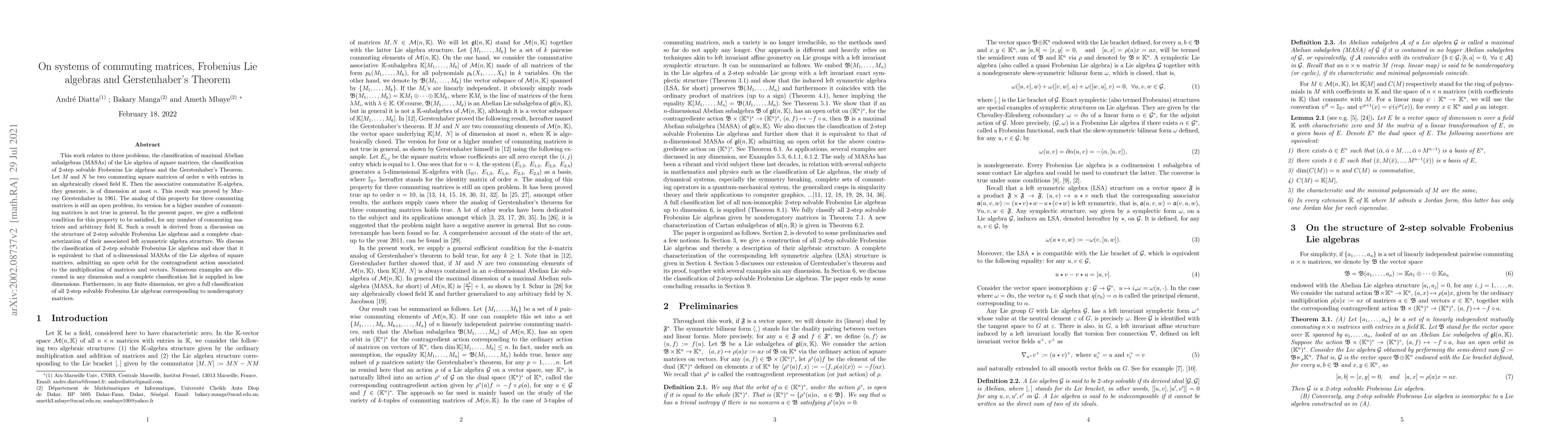 This paper classifies maximal Abelian subalgebras of the Lie algebra of square matrices and 2-step solvable Frobenius Lie algebras, providing a sufficient condition for commuting matrices to generate associative commutative algebras of dimension at most n. It also offers a complete classification of these Lie algebras in low dimensions and for nonderogatory matrices.