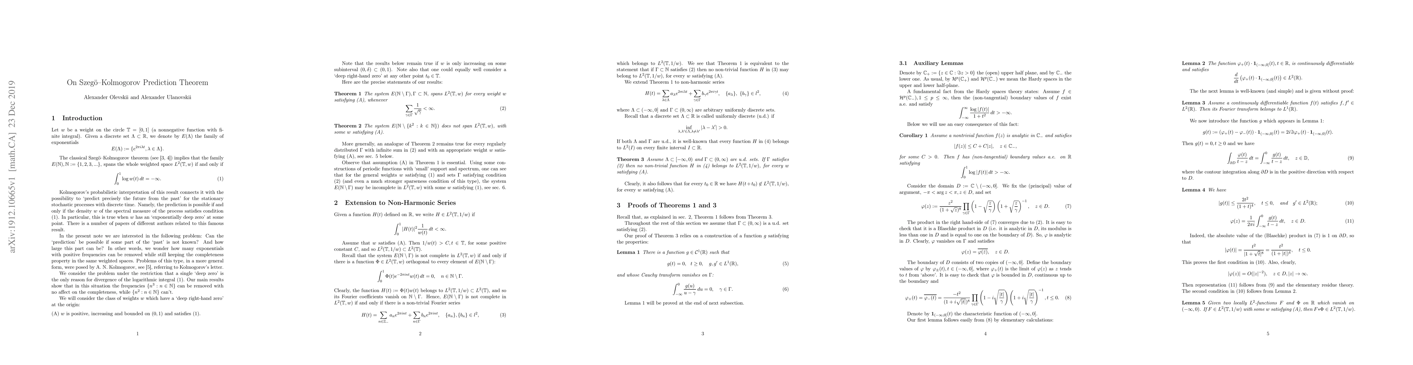 The Szeg"{o}--Kolmogorov Prediction Theorem explores how many exponentials can be removed from the weighted space $L^2(T,w)$ while maintaining completeness, a property that enables span of positive integer frequencies.