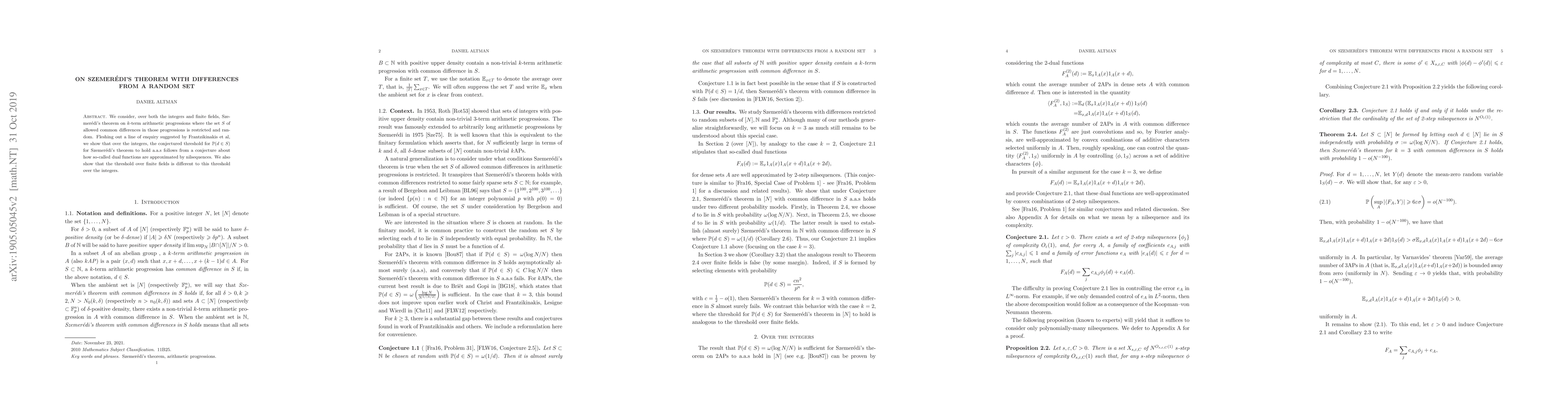 We consider, over both the integers and finite fields, Szemer\'{e}di's theorem on $k$-term arithmetic progressions where the set $S$ of allowed common differences in those progressions is restricted and random. Fleshing out a line of enquiry suggested by Frantzikinakis et al, we show that over the integers, the conjectured threshold for $\mathbb{P}(d \in S)$ for Szemer\'{e}di's theorem to hold a.a.s follows from a conjecture about how so-called dual functions are approximated by nilsequences. We also show that the threshold over finite fields is different to this threshold over the integers.
