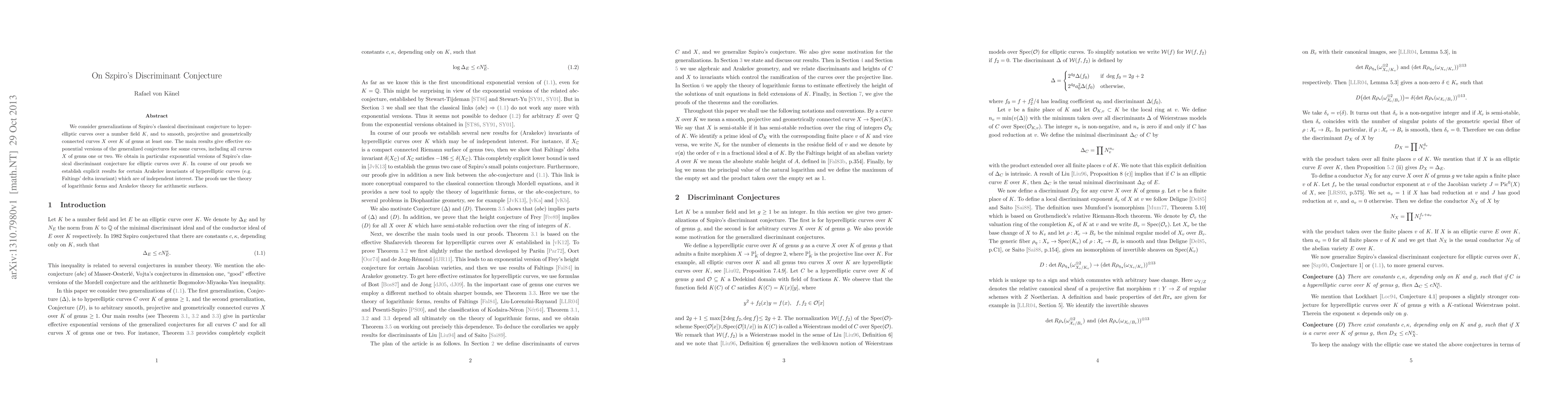 This paper generalizes Szpiro's discriminant conjecture to hyperelliptic curves over a number field and proves effective exponential versions for curves of genus one or two. The study also establishes explicit results for Arakelov invariants, utilizing the theory of logarithmic forms and Arakelov theory.