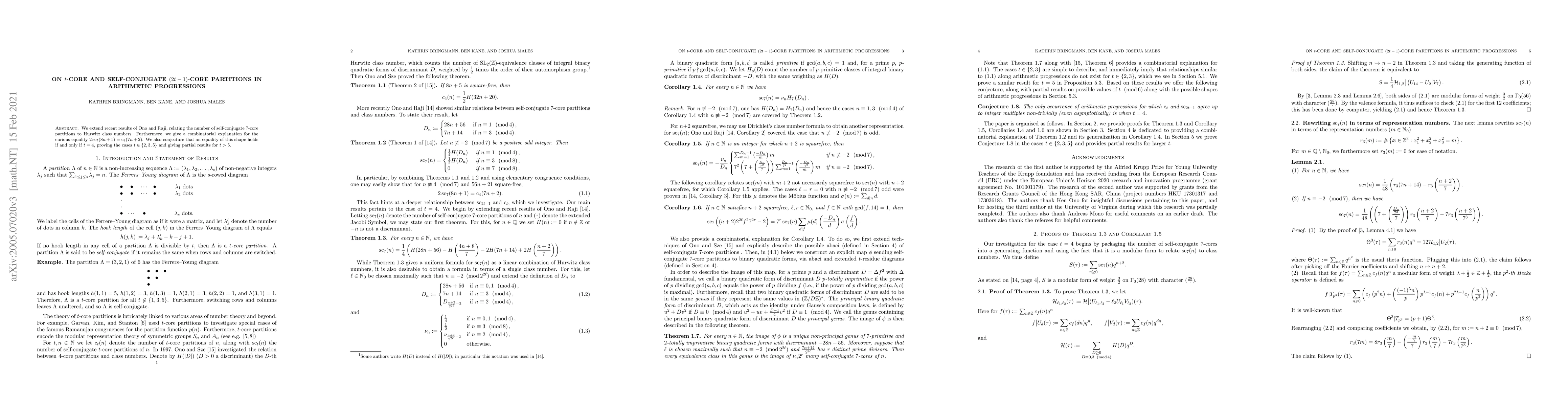 Summary: This paper extends results linking self-conjugate $7$-core partitions to Hurwitz class numbers and explains the equality $2\operatorname{sc}_7(8n+1) = \operatorname{c}_4(7n+2)$. It conjectures that similar equalities hold only for $t=4$, proving cases for $t\in\{2,3,5\}$ and providing partial results for $t>5$.