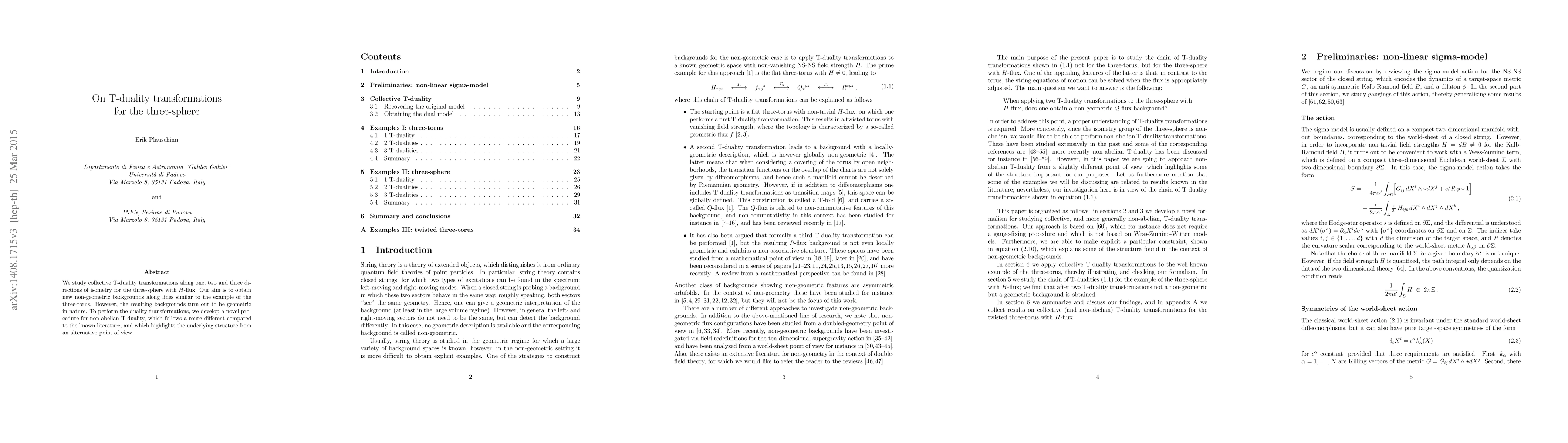 We study collective T-duality transformations along one, two and three directions of isometry for the three-sphere with H-flux. Our aim is to obtain new non-geometric backgrounds along lines similar to the example of the three-torus. However, the resulting backgrounds turn out to be geometric in nature. To perform the duality transformations, we develop a novel procedure for non-abelian T-duality, which follows a route different compared to the known literature, and which highlights the underlying structure from an alternative point of view.