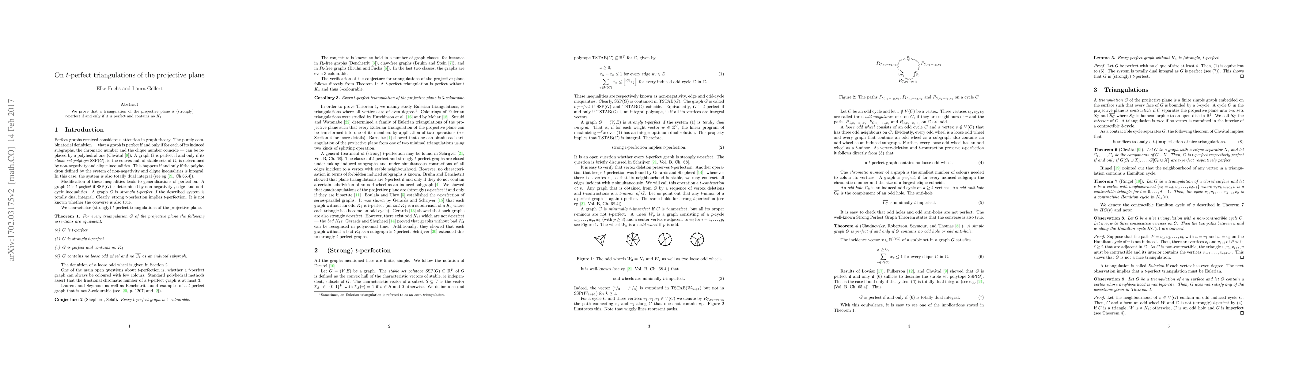 We prove that a triangulation of the projective plane is (strongly) $t$-perfect if and only if it is perfect and contains no $K_4$.