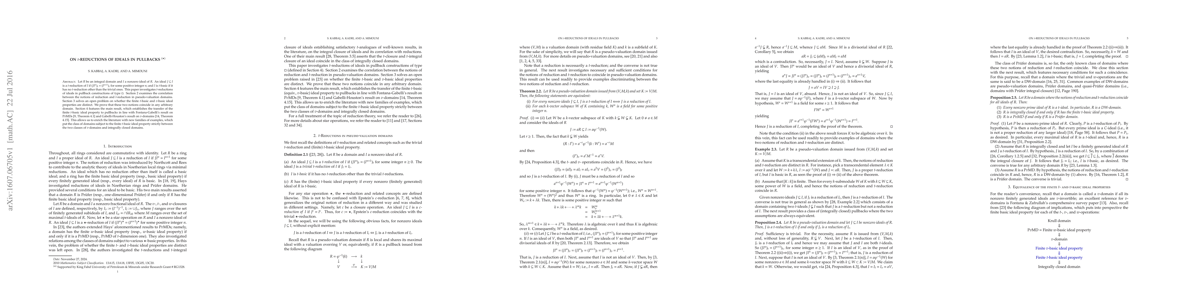 This paper explores t-reductions of ideals in pullback constructions, proving that finite t-basic and v-basic ideal properties coincide in any arbitrary domain. It establishes the transfer of the finite t-basic ideal property to pullbacks, situating it between v-domains and integrally closed domains.