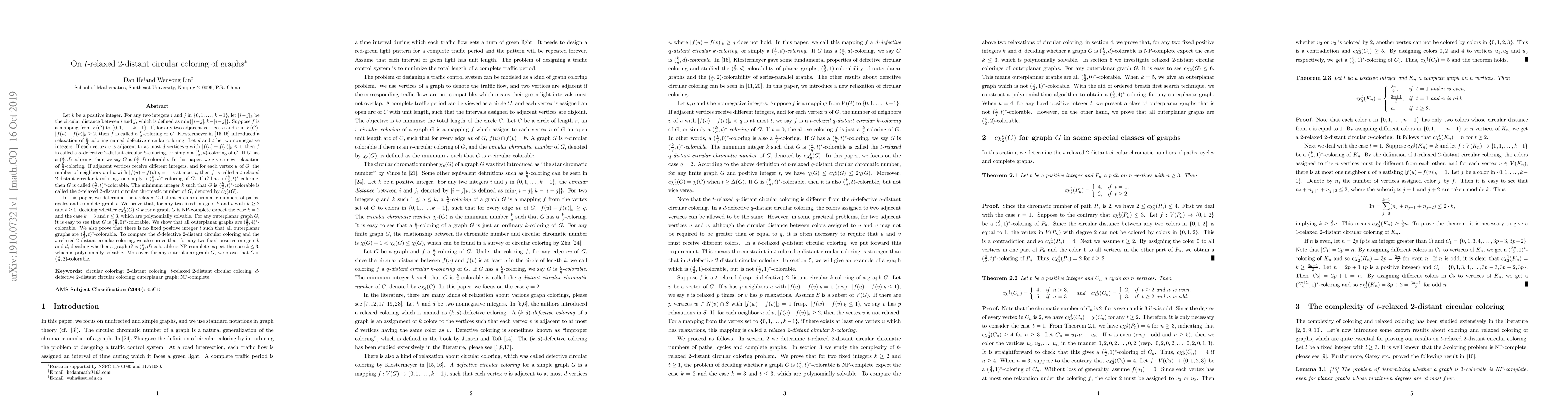 Let $k$ be an positive integer. For any two integers $i$ and $j$ in $\{0,1,\dots,k-1\}$, let $|i-j|_k=\min\{|i-j|,k-|i-j|\}$ be the circular distance between $i$ and $j$. Let $t$ be a nonnegative integer. Suppose $f$ is a mapping from $V(G)$ to $\{0,1,\dots,k-1\}$. If adjacent vertices receive different integers, and for each vertex $u$ of $G$, the number of neighbors $v$ of $u$ with $|f(u)-f(v)|_k=1$ is at most $t$, then $f$ is called a $t$-relaxed 2-distant circular $k$-coloring, or simply a $(\frac{k}{2},t)^*$-coloring of $G$. If $G$ has a $(\frac{k}{2},t)^*$-coloring, then $G$ is called $(\frac{k}{2},t)^*$-colorable. In this paper, we prove that, for any two fixed integers $k$ and $t$ with $k\geq2$ and $t\geq1$, deciding whether $G$ is $(\frac{k}{2},t)^*$-colorable is NP-complete expect the case $k=2$ and the case $k=3$ and $t\leq3$, which are polynomially solvable. For any outerplanar graph $G$, e show that all outerplanar graphs are $(\frac{5}{2},4)^*$-colorable, we prove that there is no fixed positive integer $t$ such that all outerplanar graphs are $(\frac{4}{2},t)^*$-colorable.