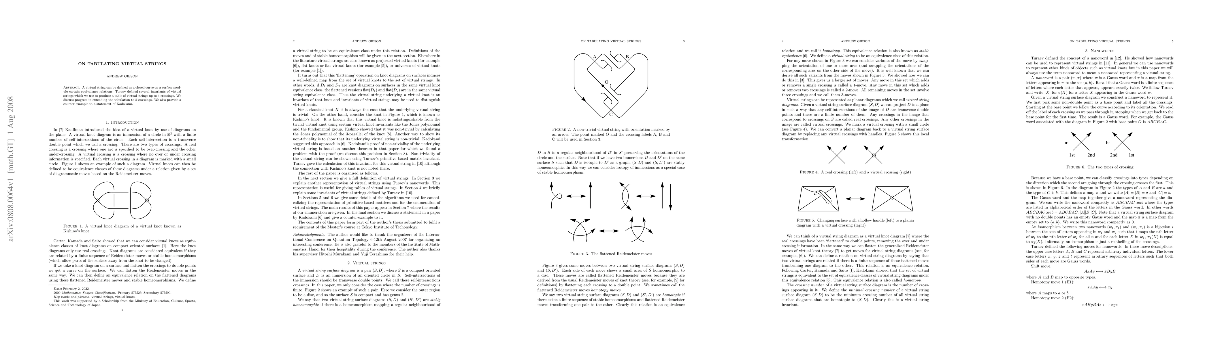 This paper tabulates virtual strings, closed curves on surfaces under equivalence relations, up to 4 crossings using Turaev's invariants, and extends the tabulation to 5 crossings. It also refutes a claim by Kadokami with a counterexample.