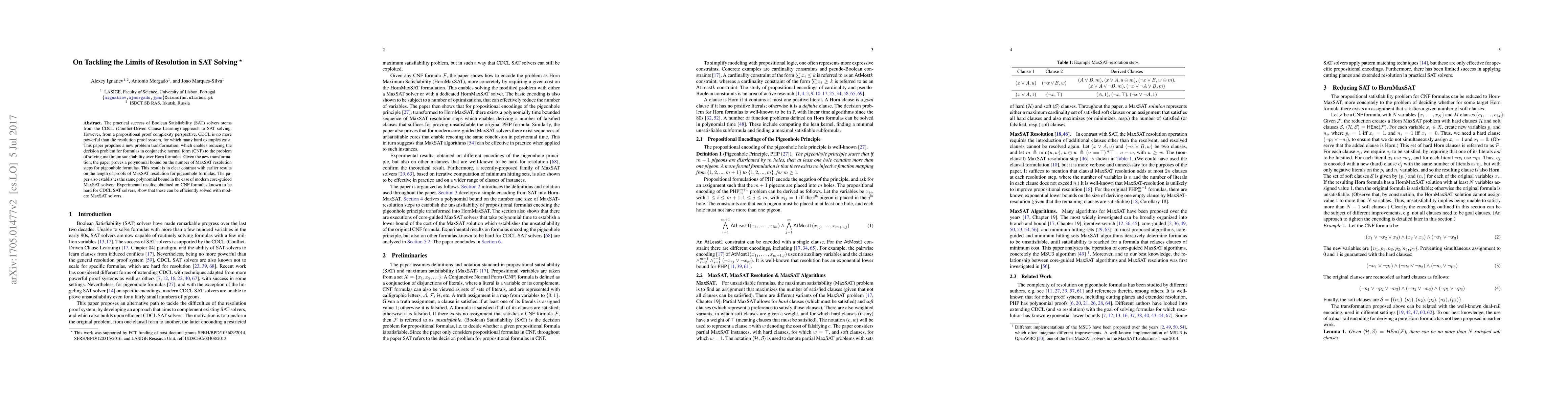 The practical success of Boolean Satisfiability (SAT) solvers stems from the CDCL (Conflict-Driven Clause Learning) approach to SAT solving. However, from a propositional proof complexity perspective, CDCL is no more powerful than the resolution proof system, for which many hard examples exist. This paper proposes a new problem transformation, which enables reducing the decision problem for formulas in conjunctive normal form (CNF) to the problem of solving maximum satisfiability over Horn formulas. Given the new transformation, the paper proves a polynomial bound on the number of MaxSAT resolution steps for pigeonhole formulas. This result is in clear contrast with earlier results on the length of proofs of MaxSAT resolution for pigeonhole formulas. The paper also establishes the same polynomial bound in the case of modern core-guided MaxSAT solvers. Experimental results, obtained on CNF formulas known to be hard for CDCL SAT solvers, show that these can be efficiently solved with modern MaxSAT solvers.