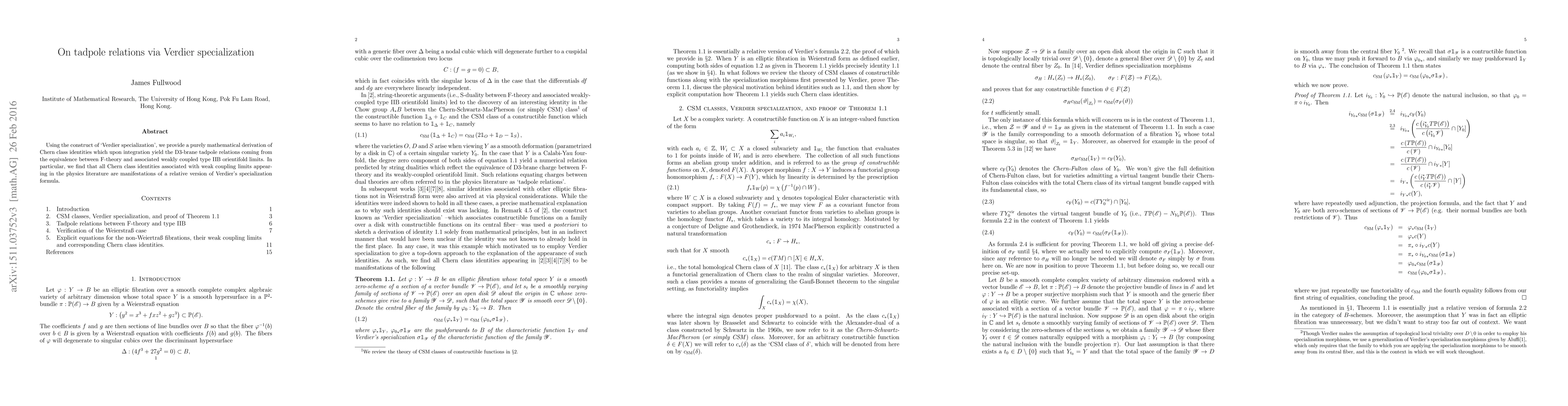 Using the construct of "Verdier specialization", we provide a purely mathematical derivation of Chern class identities which upon integration yield the D3-brane tadpole relations coming from the equivalence between F-theory and associated weakly coupled type IIB orientifold limits. In particular, we find that all Chern class identities associated with weak coupling limits appearing in the physics literature are manifestations of a relative version of Verdier's specialization formula.