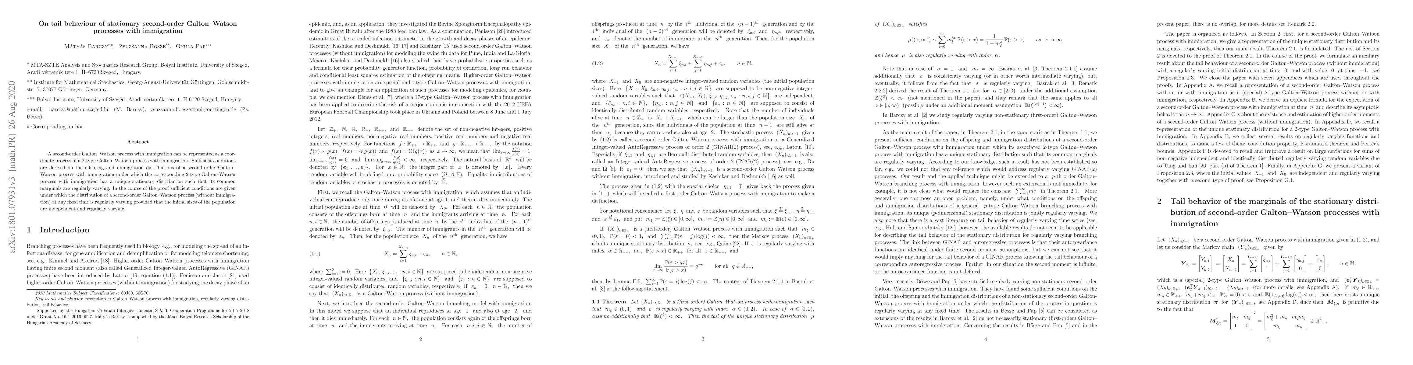 This paper investigates the tail behavior of stationary second-order Galton-Watson processes with immigration, deriving sufficient conditions for the existence of a unique stationary distribution with regularly varying marginals. It also provides conditions for the tail behavior of a second-order Galton-Watson process without immigration when initial population sizes are independent and regularly varying.