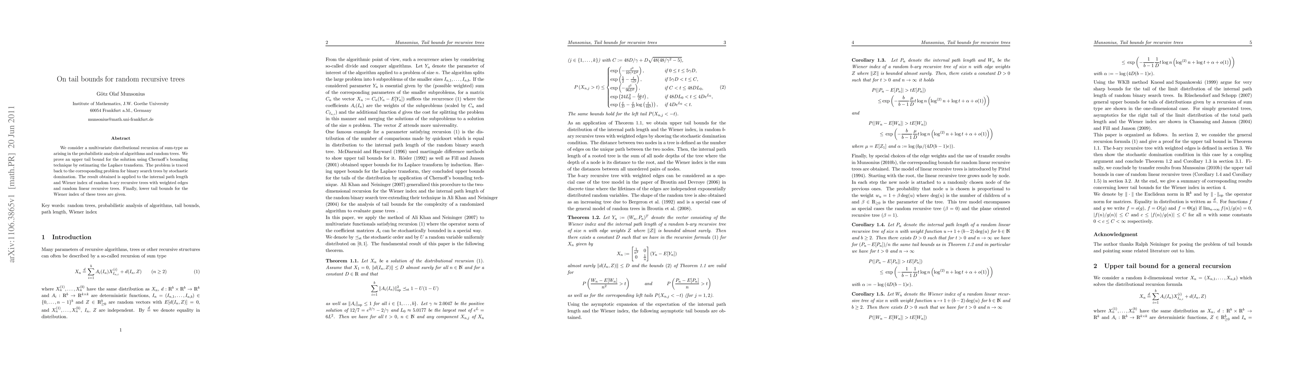 This paper proves an upper tail bound for a multivariate distributional recursion in random recursive trees using Chernoff's method and applies it to analyze internal path length and Wiener index in random b-ary and linear recursive trees. It also provides lower tail bounds for the Wiener index.