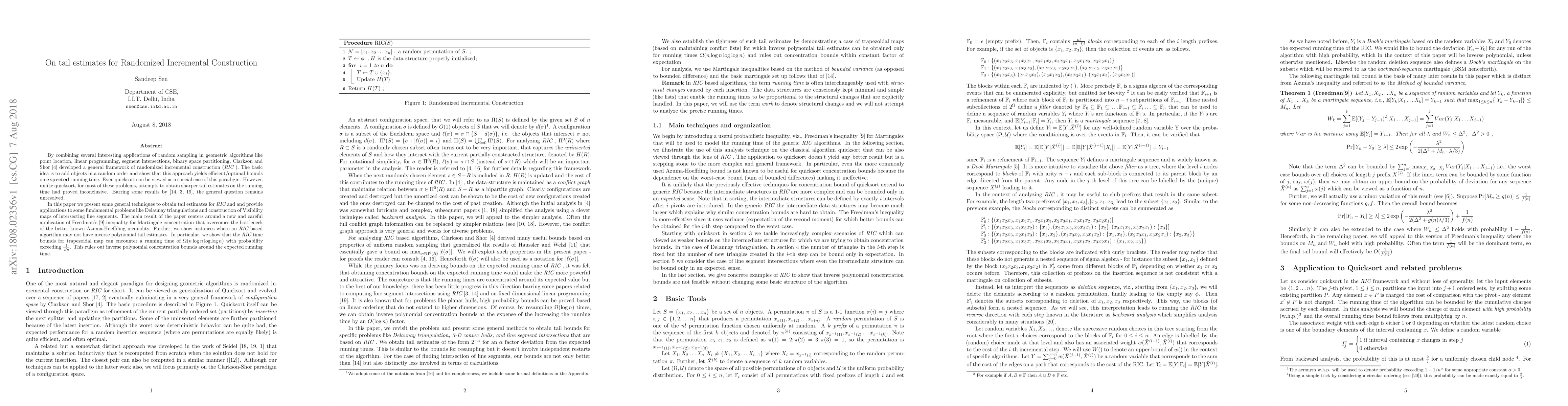 By combining several interesting applications of random sampling in geometric algorithms like point location, linear programming, segment intersections, binary space partitioning, Clarkson and Shor \cite{CS89} developed a general framework of randomized incremental construction (RIC ). The basic idea is to add objects in a random order and show that this approach yields efficient/optimal bounds on {\bf expected} running time. Even quicksort can be viewed as a special case of this paradigm. However, unlike quicksort, for most of these problems, attempts to obtain sharper tail estimates on the running time had proved inconclusive. Barring some results by \cite{MSW93,CMS92,Seidel91a}, the general question remains unresolved. In this paper we present some general techniques to obtain tail estimates for RIC and and provide applications to some fundamental problems like Delaunay triangulations and construction of Visibility maps of intersecting line segments. The main result of the paper centers around a new and careful application of Freedman's \cite{Fre75} inequality for Martingale concentration that overcomes the bottleneck of the better known Azuma-Hoeffding inequality. Further, we show instances where an RIC based algorithm may not have inverse polynomial tail estimates. In particular, we show that the RIC time bounds for trapezoidal map can encounter a running time of $\Omega (n\log n\log\log n )$ with probability exceeding $\frac{1}{\sqrt{n}}$. This rules out inverse polynomial concentration bounds around the expected running time.