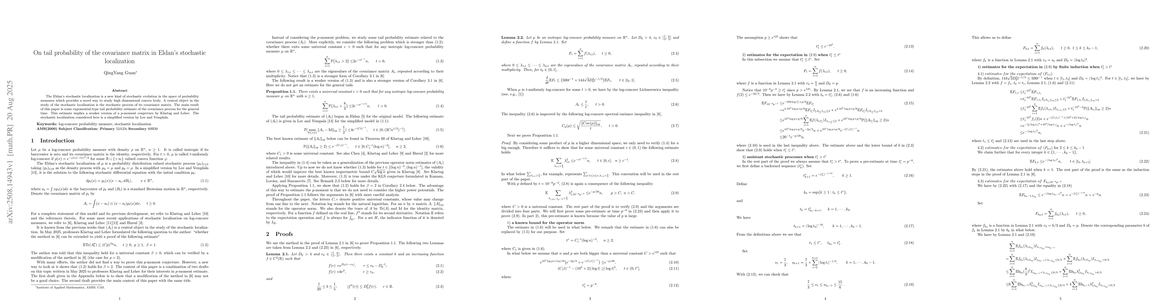 The Eldan's stochastic localization is a new kind of stochastic evolution in the space of probability measures which provides a novel way to study high dimensional convex body. A central object in the study of the stochastic localization is the stochastic process of its covariance matrix. The main result of this paper is some exponential-type tail probability estimate of the covariance process for the general time. This estimate implies a weaker version of a $p$-moment conjecture by Klartag and Lehec. The stochastic localization considered here is a simplified version by Lee and Vemplala.