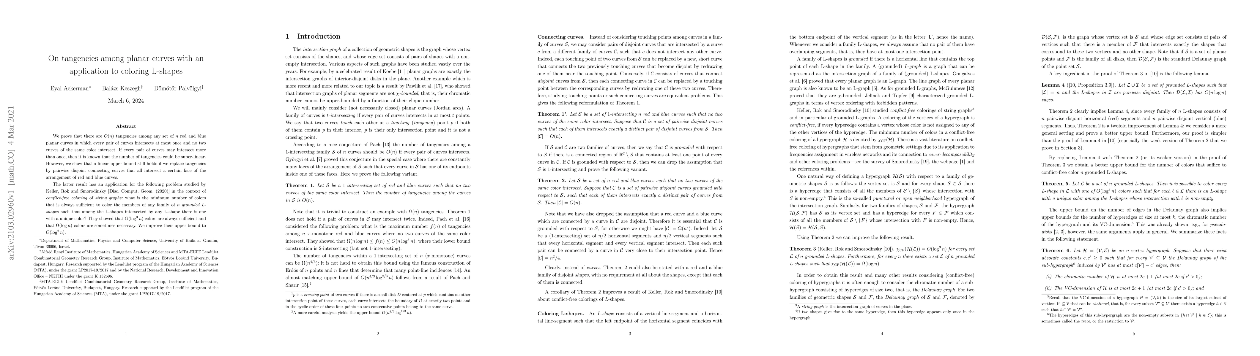 We prove that there are $O(n)$ tangencies among any set of $n$ red and blue planar curves in which every pair of curves intersects at most once and no two curves of the same color intersect. If every pair of curves may intersect more than once, then it is known that the number of tangencies could be super-linear. However, we show that a linear upper bound still holds if we replace tangencies by pairwise disjoint connecting curves that all intersect a certain face of the arrangement of red and blue curves. The latter result has an application for the following problem studied by Keller, Rok and Smorodinsky [Disc.\ Comput.\ Geom.\ (2020)] in the context of \emph{conflict-free coloring} of \emph{string graphs}: what is the minimum number of colors that is always sufficient to color the members of any family of $n$ \emph{grounded L-shapes} such that among the L-shapes intersected by any L-shape there is one with a unique color? They showed that $O(\log^3 n)$ colors are always sufficient and that $\Omega(\log n)$ colors are sometimes necessary. We improve their upper bound to $O(\log^2 n)$.