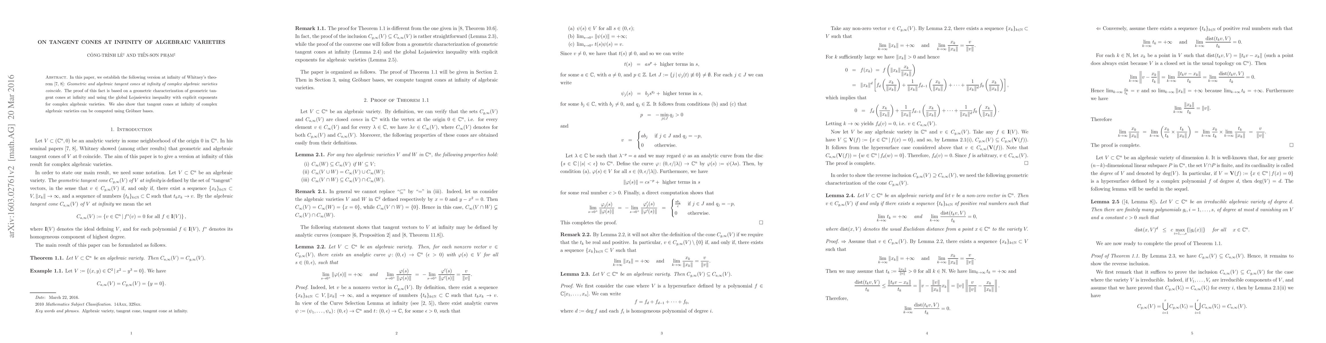 In this paper, we establish the following version at infinity of Whitney's theorem [6, 7]: Geometric and algebraic tangent cones at infinity of complex algebraic varieties coincide. The proof of this fact is based on a geometric characterization of geometric tangent cones at infinity and using the global \L ojasiewicz inequality with explicit exponents for complex algebraic varieties. We also show that tangent cones at infinity of complex algebraic varieties can be computed using Gr\"obner bases.