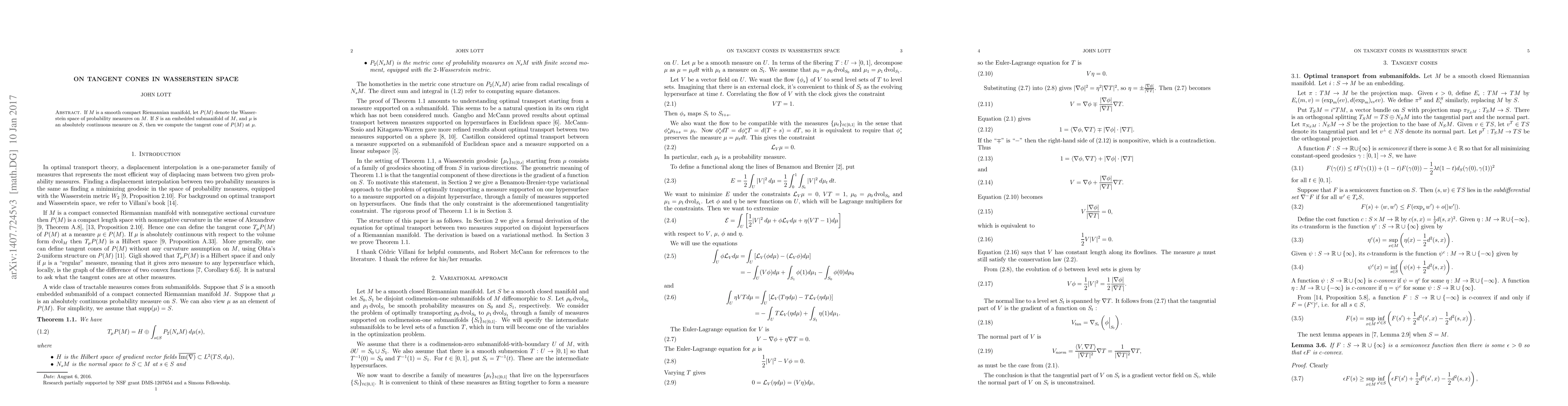 If M is a smooth compact Riemannian manifold, let P(M) denote the Wasserstein space of probability measures on M. If S is an embedded submanifold of M, and $\mu$ is an absolutely continuous measure on S, then we compute the tangent cone of P(M) at $\mu$.