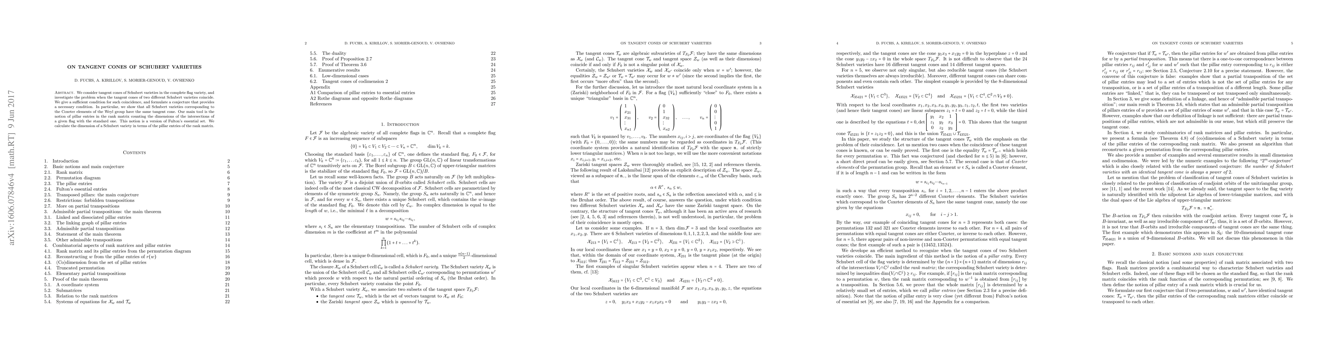 This paper studies tangent cones of Schubert varieties within the complete flag variety, identifying conditions under which the tangent cones of different Schubert varieties coincide. It provides a sufficient condition for coincidence and proposes a conjecture for the necessary condition, specifically showing that Schubert varieties corresponding to Coxeter elements share the same tangent cone. The research leverages the concept of pillar entries in rank matrices to determine Schubert variety dimensions.