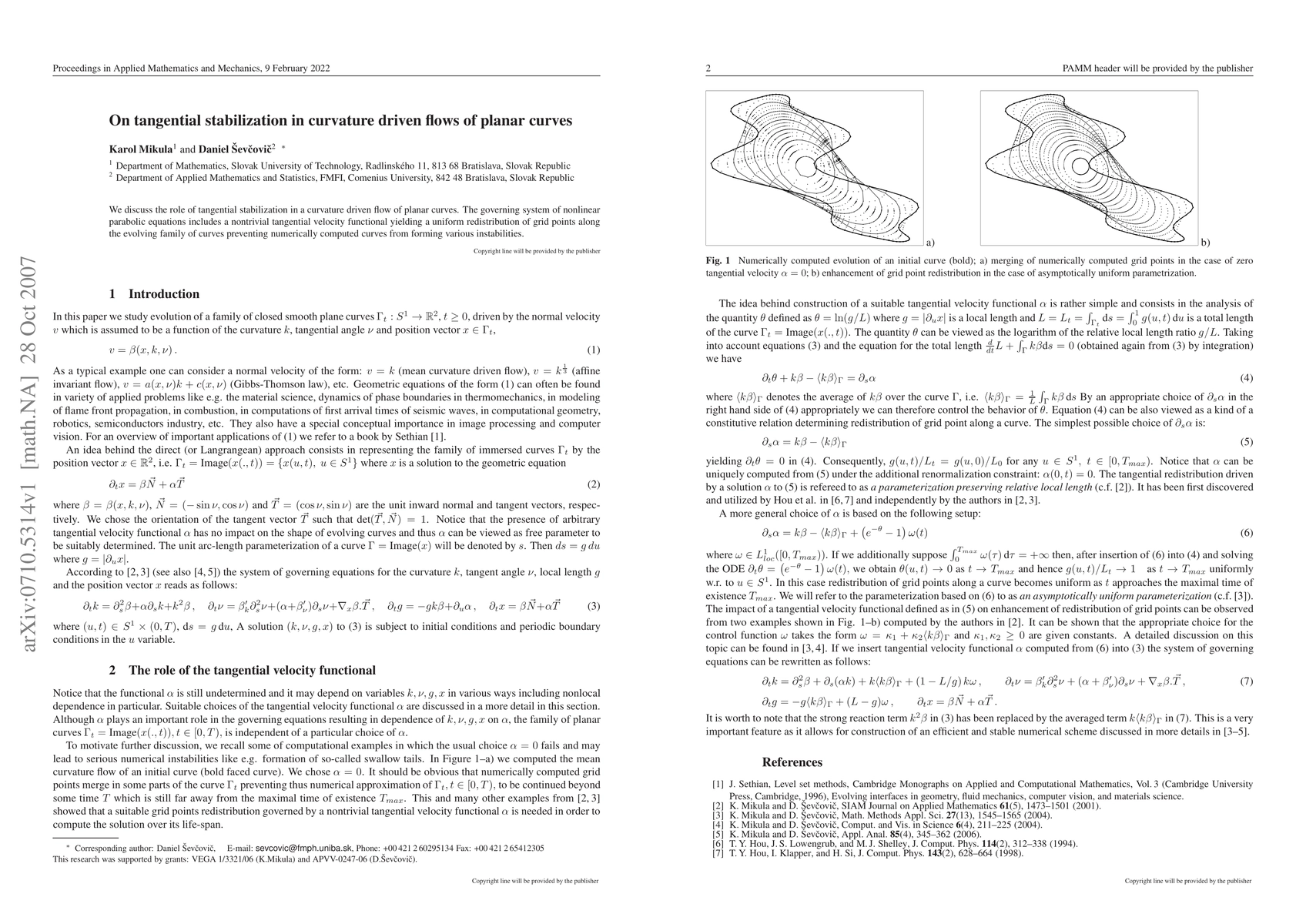 Summary: This paper explores tangential stabilization in curvature-driven flows of planar curves, focusing on a nonlinear parabolic system that redistributes grid points uniformly to prevent numerical instabilities during curve evolution.