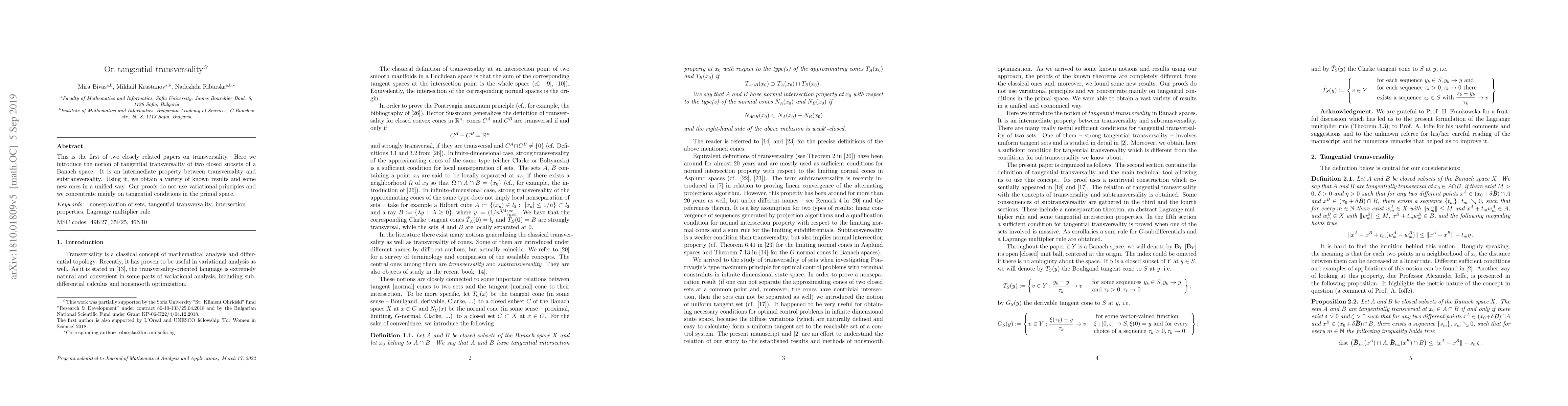 The paper introduces the concept of tangential transversality for closed subsets of a Banach space, utilizing a primal space focus and avoiding variational principles.