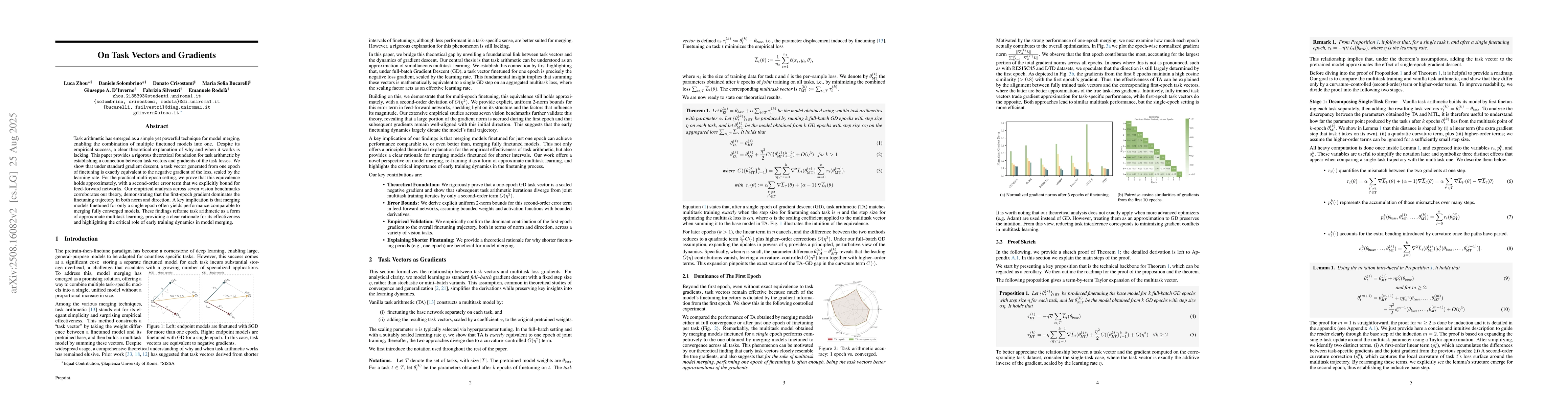 Task arithmetic has emerged as a simple yet powerful technique for model merging, enabling the combination of multiple finetuned models into one. Despite its empirical success, a clear theoretical explanation of why and when it works is lacking. This paper provides a rigorous theoretical foundation for task arithmetic by establishing a connection between task vectors and gradients of the task losses. We show that under standard gradient descent, a task vector generated from one epoch of finetuning is exactly equivalent to the negative gradient of the loss, scaled by the learning rate. For the practical multi-epoch setting, we prove that this equivalence holds approximately, with a second-order error term that we explicitly bound for feed-forward networks. Our empirical analysis across seven vision benchmarks corroborates our theory, demonstrating that the first-epoch gradient dominates the finetuning trajectory in both norm and direction. A key implication is that merging models finetuned for only a single epoch often yields performance comparable to merging fully converged models. These findings reframe task arithmetic as a form of approximate multitask learning, providing a clear rationale for its effectiveness and highlighting the critical role of early training dynamics in model merging.