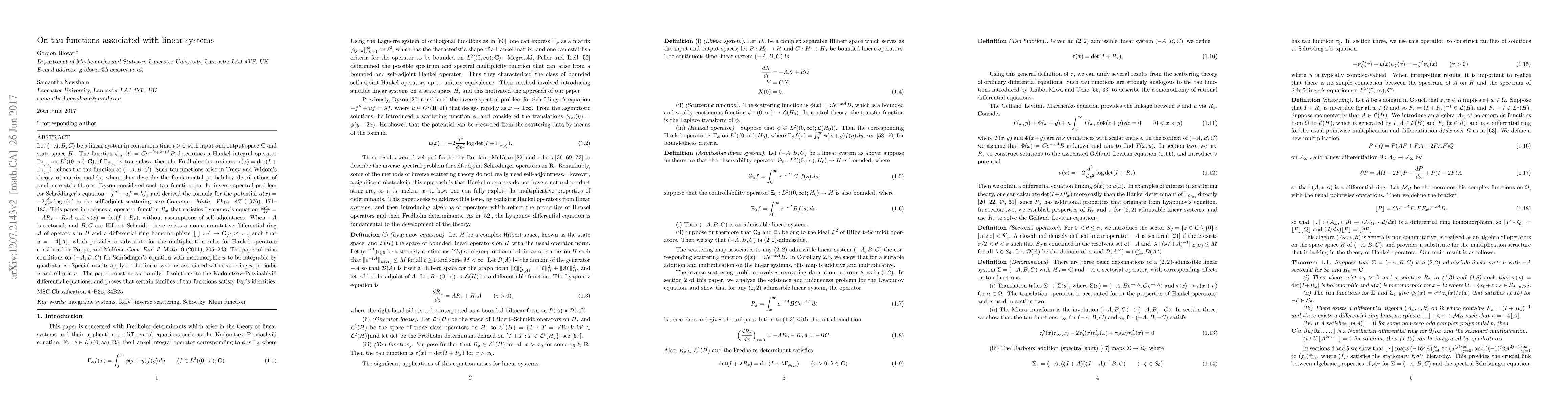 Let $(-A,B,C)$ be a linear system in continuous time $t>0$ with input and output space ${\bf C}$ and state space $H$. The function $\phi_{(x)}(t)=Ce^{-(t+2x)A}B$ determines a Hankel integral operator $\Gamma_{\phi_{(x)}}$ on $L^2((0, \infty ); {\bf C})$; if $\Gamma_{\phi_{(x)}}$ is trace class, then the Fredholm determinant $\tau (x)=\det (I+ \Gamma_{\phi_{(x)}})$ defines the tau function of $(-A,B,C)$. Such tau functions arise in Tracy and Widom's theory of matrix models, where they describe the fundamental probability distributions of random matrix theory. Dyson considered such tau functions in the inverse spectral problem for Schr\"odinger's equation $-f''+uf=\lambda f$, and derived the formula for the potential $u(x)=-2{{d^2}\over{dx^2}}\log \tau (x)$ in the self-adjoint scattering case {\sl Commun. Math. Phys.} {\bf 47} (1976), 171--183. This paper introduces a operator function $R_x$ that satisfies Lyapunov's equation ${{dR_x}\over{dx}}=-AR_x-R_xA$ and $\tau (x)=\det (I+R_x)$, without assumptions of self-adjointness. When $-A$ is sectorial, and $B,C$ are Hilbert--Schmidt, there exists a non-commutative differential ring ${\cal A}$ of operators in $H$ and a differential ring homomorphism $\lfloor\,\,\rfloor :{\cal A}\rightarrow {\bf C}[u,u', \dots ]$ such that $u=-4\lfloor A\rfloor$, which provides a substitute for the multiplication rules for Hankel operators considered by P\"oppe, and McKean {\sl Cent. Eur. J. Math.} {\bf 9} (2011), 205--243. The paper obtains conditions on $(-A,B,C)$ for Schr\"odinger's equation with meromorphic $u$ to be integrable by quadratures. Special results apply to the linear systems associated with scattering $u$, periodic $u$ and elliptic $u$. The paper constructs a family of solutions to the Kadomtsev--Petviashivili differential equations, and proves that certain families of tau functions satisfy Fay's identities.\par