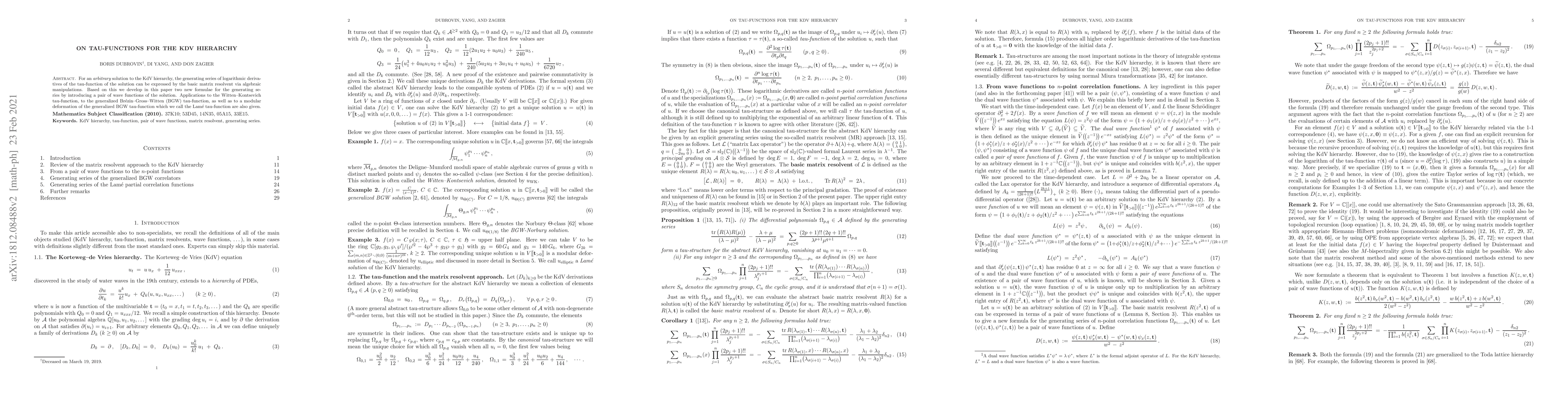 For an arbitrary solution to the KdV hierarchy, the generating series of logarithmic derivatives of the tau-function of the solution can be expressed by the basic matrix resolvent via algebraic manipulations. Based on this we develop in this paper two new formulae for the generating series by introducing a pair of wave functions of the solution. Applications to the Witten--Kontsevich tau-function, to the generalized Br\'ezin--Gross--Witten (BGW) tau-function, as well as to a modular deformation of the generalized BGW tau-function which we call the Lam\'e tau-function are also given.