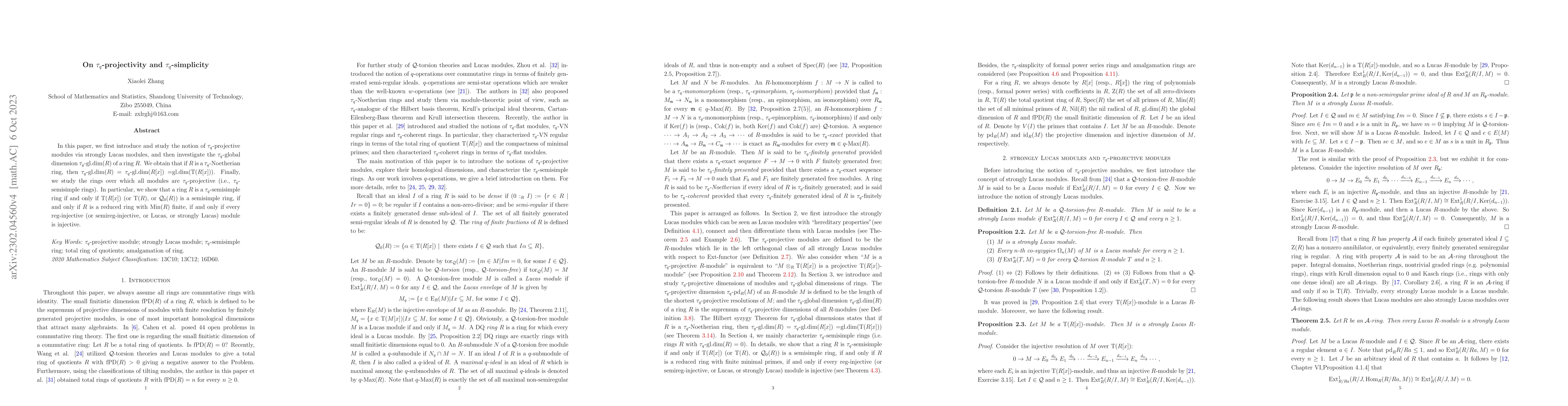 In this paper, we first introduce and study the notion of $\tau_q$-projective modules via strongly Lucas modules, and then investigate the $\tau_q$-global dimension $\tau_q$-\gld$(R)$ of a ring $R$. We obtain that if $R$ is a $\tau_q$-Noetherian ring, then $\tau_q$-\gld$(R)=\tau_q$-\gld$(R[x])=$\gld$({\rm T}(R[x]))$. Finally, we study the rings over which all modules are $\tau_q$-projective (i.e., $\tau_q$-semisimple rings). In particular, we show that a ring $R$ is a $\tau_q$-semisimple ring if and only if ${\rm T}(R[x])$ (or ${\rm T}(R)$, or $\mathcal{Q}_0(R)$) is a semisimple ring, if and only if $R$ is a reduced ring with ${\rm Min}(R)$ finite, if and only if every reg-injective (or semireg-injective, or Lucas, or strongly Lucas) module is injective.