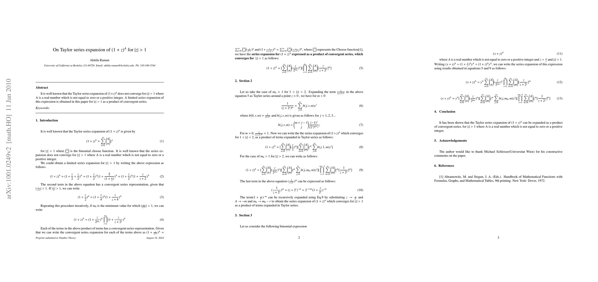 This paper presents a limited series expansion for $(1+ z)^{A}$ when $|z|>1$, where $A$ is a real number not equal to zero or a positive integer. The expansion is expressed as a product of convergent series, addressing the non-convergence issue for $|z|>1$.