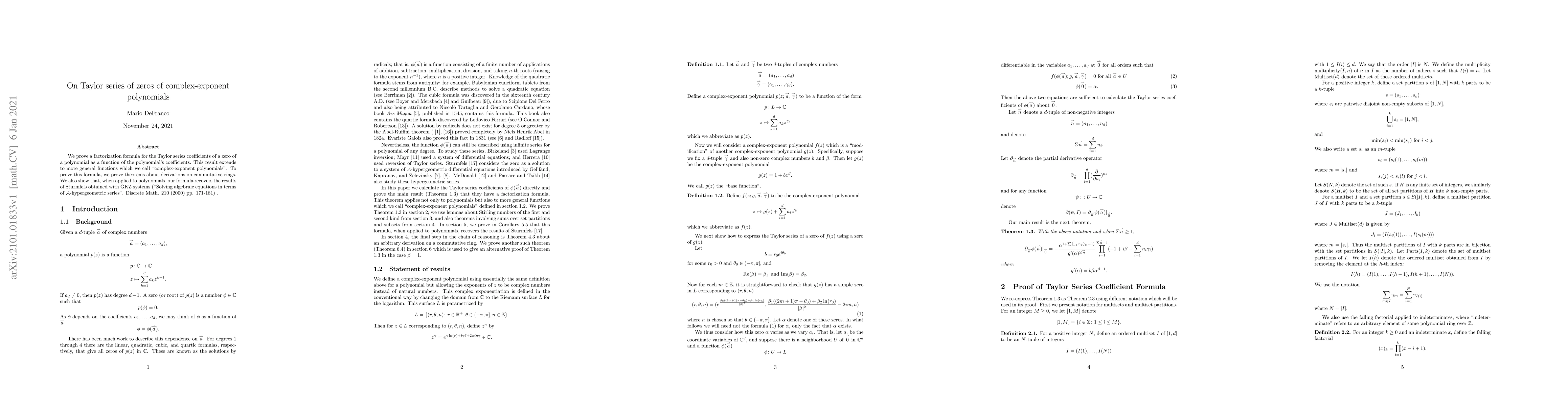 The paper establishes a factorization formula for Taylor series coefficients of zeros of polynomials and extends it to complex-exponent polynomials, leveraging theorems about derivations on commutative rings.