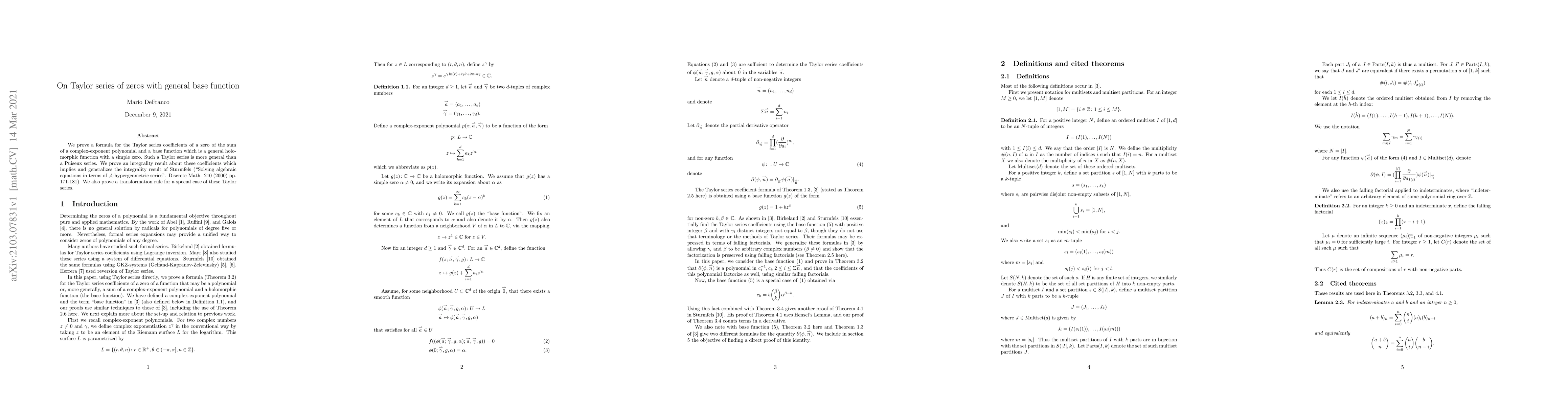 The paper proves formulas and theorems related to Taylor series coefficients of zeros for sums of complex-exponent polynomials and general holomorphic functions with simple zeros, extending previous results by Sturmfels.