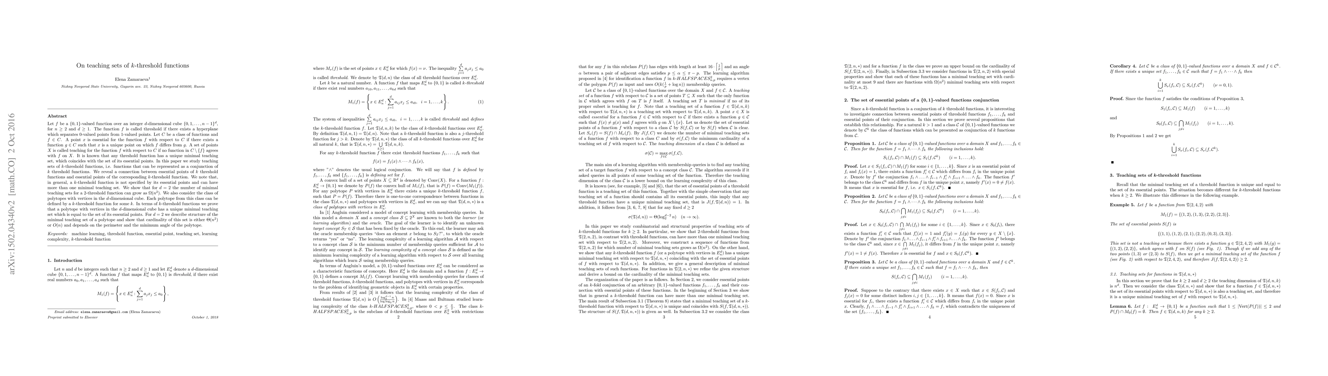 Researchers studied teaching sets of k-threshold functions, finding a connection between essential points and revealing that minimal teaching sets can grow as n^2 for d=2 threshold functions.