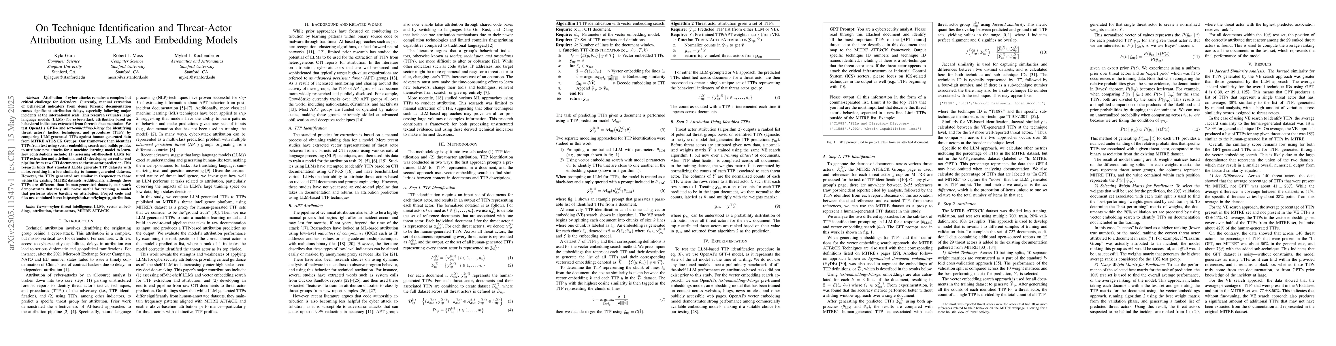Development of an end-to-end pipeline from raw CTI documents to threat-actor prediction, incorporating LLMs for TTP extraction and vector embedding models for attribution.