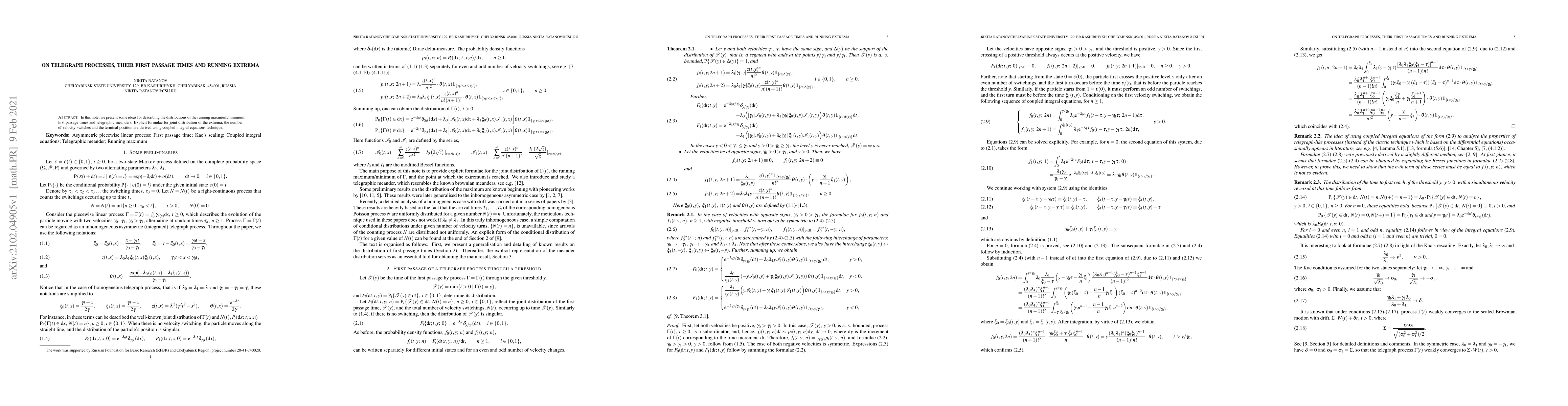 In this note, we present some ideas for describing the distributions of the running maximum/minimum, first passage times and telegraphic meanders. Explicit formulae for joint distribution of the extrema, the number of velocity switches and the terminal position are derived using coupled integral equations technique.